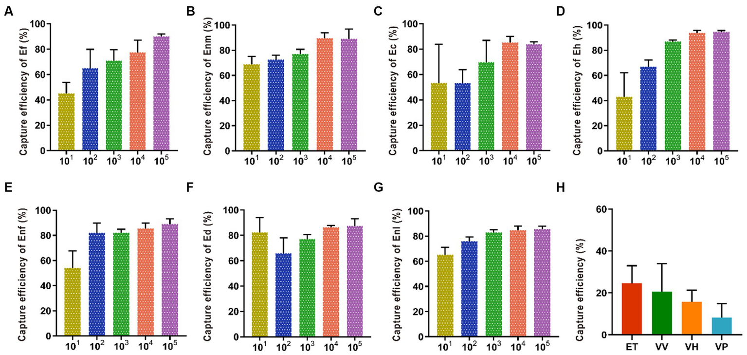 The capture efficiency of Enf in PBS with pH 7.0 was 93.68%. The capture efficiencies of Ef, Enl, Ec, Eh, Ed, and Enm in PBS with pH 8.0 were 95.07, 92.31, 97.58, 90.63, 92.07, and 93.06%, respectively. In PBS with pH 9.0, the CE is in a declining state (Figure 8).