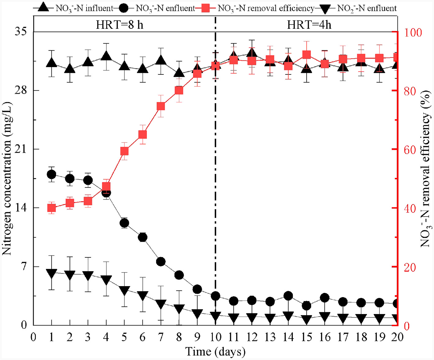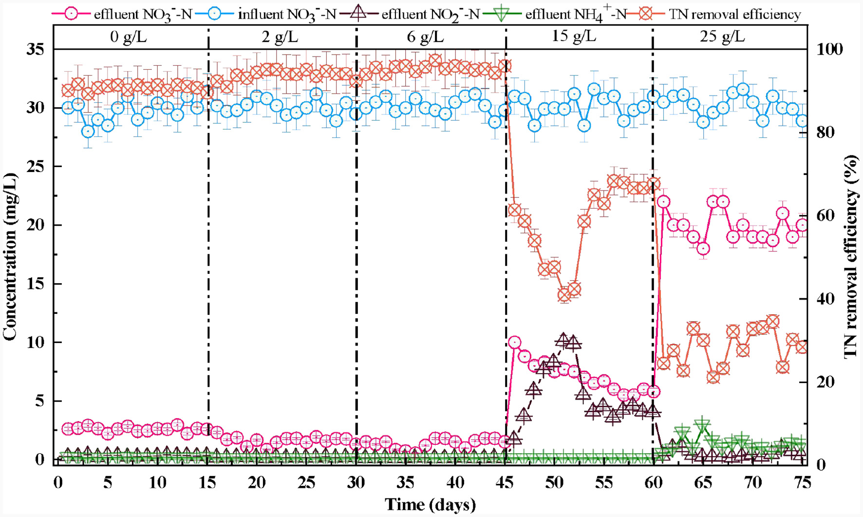 In this study, elemental sulfur was used as the reductant in a SAD reactor. NaCl was added to study the effect of salinity on nitrogen transformation. The relationship between salinity and microbial community structure was also analyzed. The results provide a reference for the application of SAD in high-nitrate high-salinity wastewater.