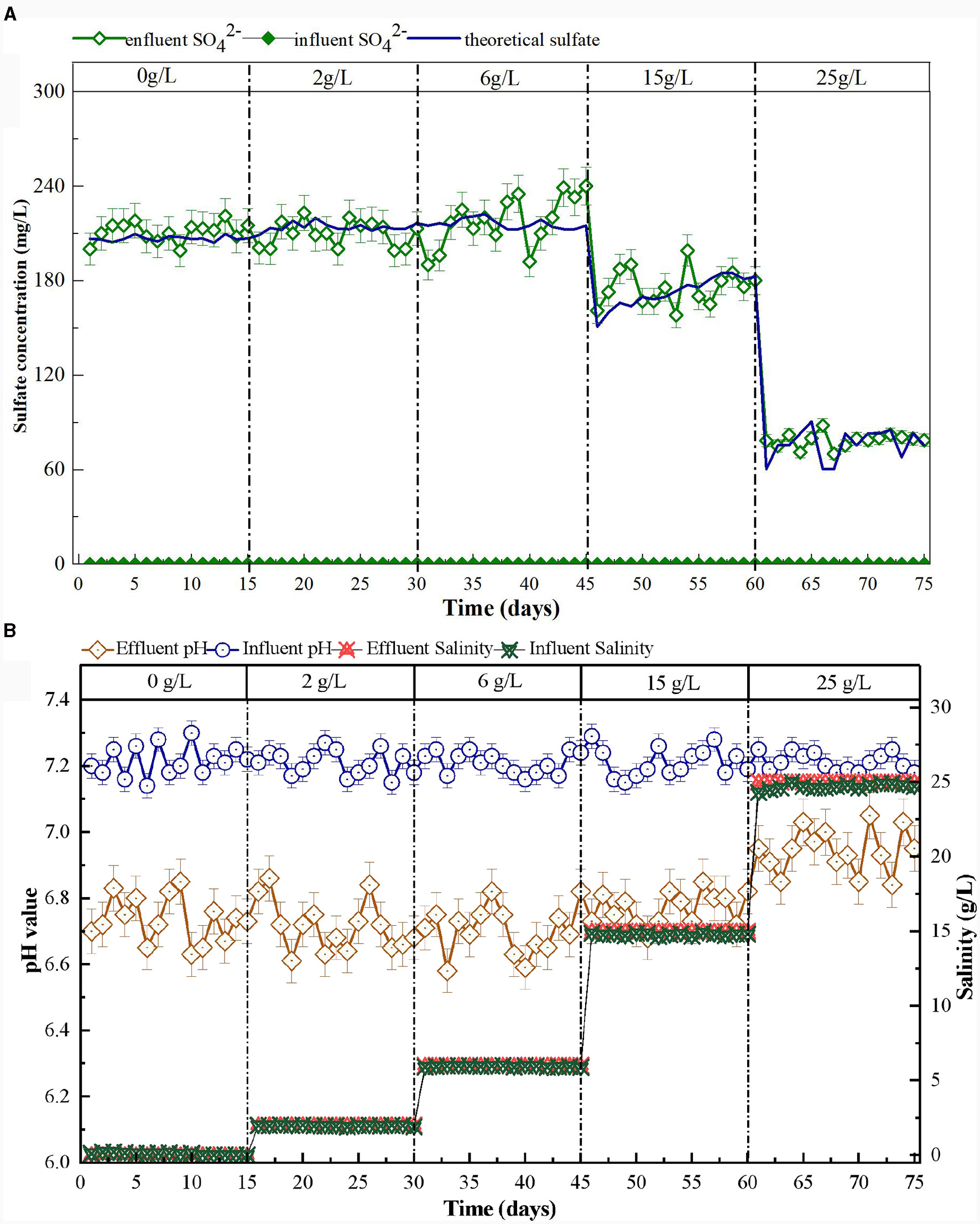 Variation of sulfate concentration (A), pH and salinity (B) in S0-driven SAD system at different salinity.