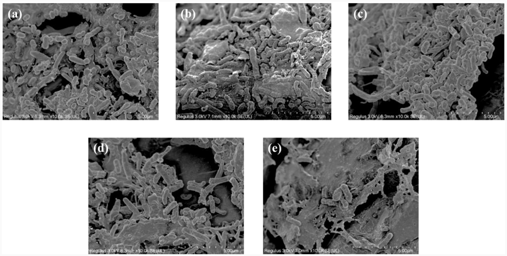 To further explore the influence of salinity on the performance of the SAD system, SEM and microbial community analysis were performed on the filler samples collected at the reactor startup (0 g/L salinity), 2, 6, 15, and 25 g/L salinity levels, respectively.