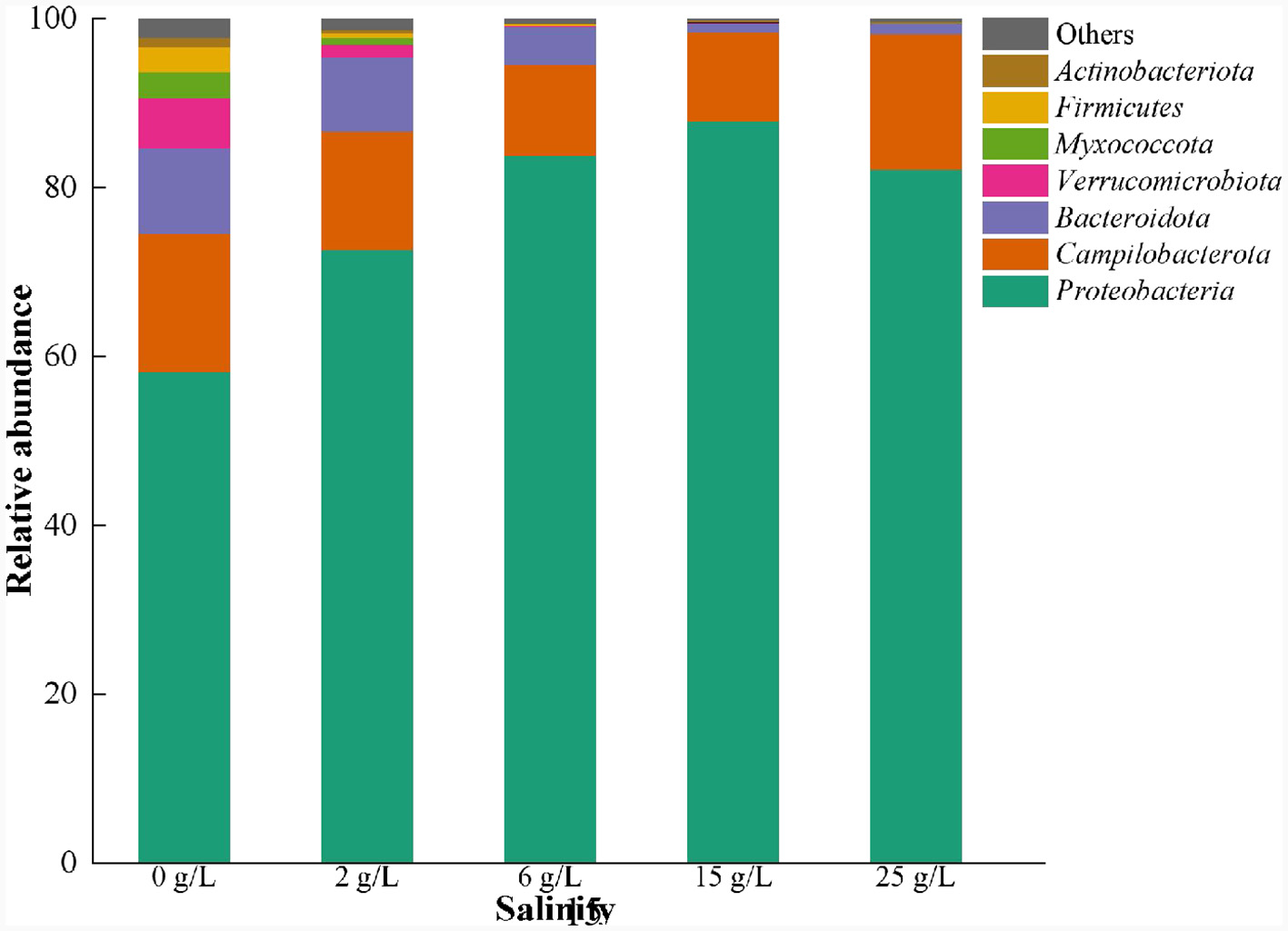 Microbial community changes at phylum level in S0-driven SAD system at different salinity.