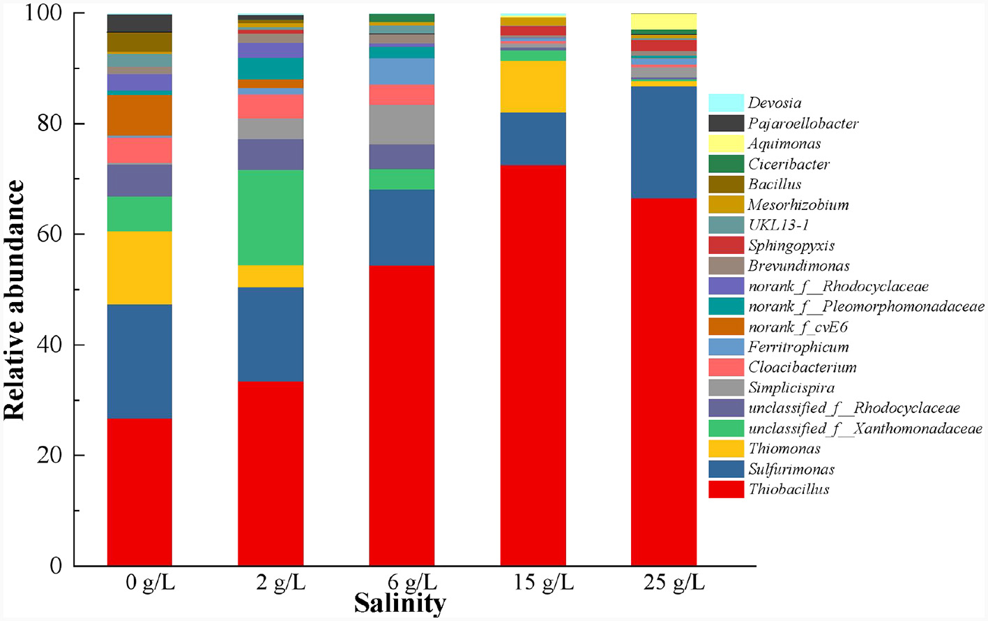 Microbial community changes at genus level in S0-driven SAD system at different salinity.