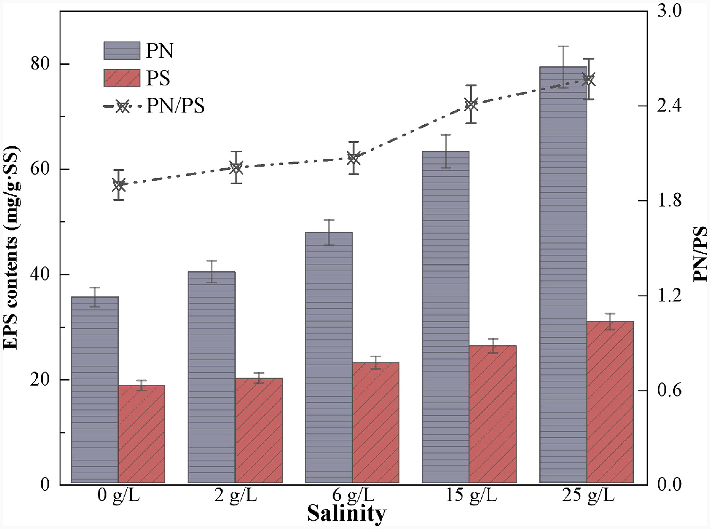 The results showed that the EPS content gradually increased with increasing salinity (Figure 8), consistent with the phenomenon observed by Song et al. (2016). PN is usually considered a hydrophobic substance crucial for resisting external osmotic pressures and improving sludge performance (Han et al., 2018). Previous studies found that microorganisms in the system secrete more PN under salinity stress (Lin et al., 2022; Sun et al., 2022). This is because the amino and carboxyl groups in PN increase the hydrophobicity of the cell surface, which helps to maintain the structure and stability of the biofilm (Wang et al., 2013; He et al., 2019). In this study, the PN content increased from 35.5 to 79.3 mg/g SS, and the PS content from 18.6 to 30.8 mg/g SS with the contentious increase in salinity (Figure 8). Furthermore, the PN/PS ratio consistency increased from 1.91 in non-saline to 2.57 at 25.0 g/L salinity conditions, suggesting that the PN content exceeded the PS content. Therefore, possibly the dominant strains in the SAD system resisted the high salinity stress by releasing PN.