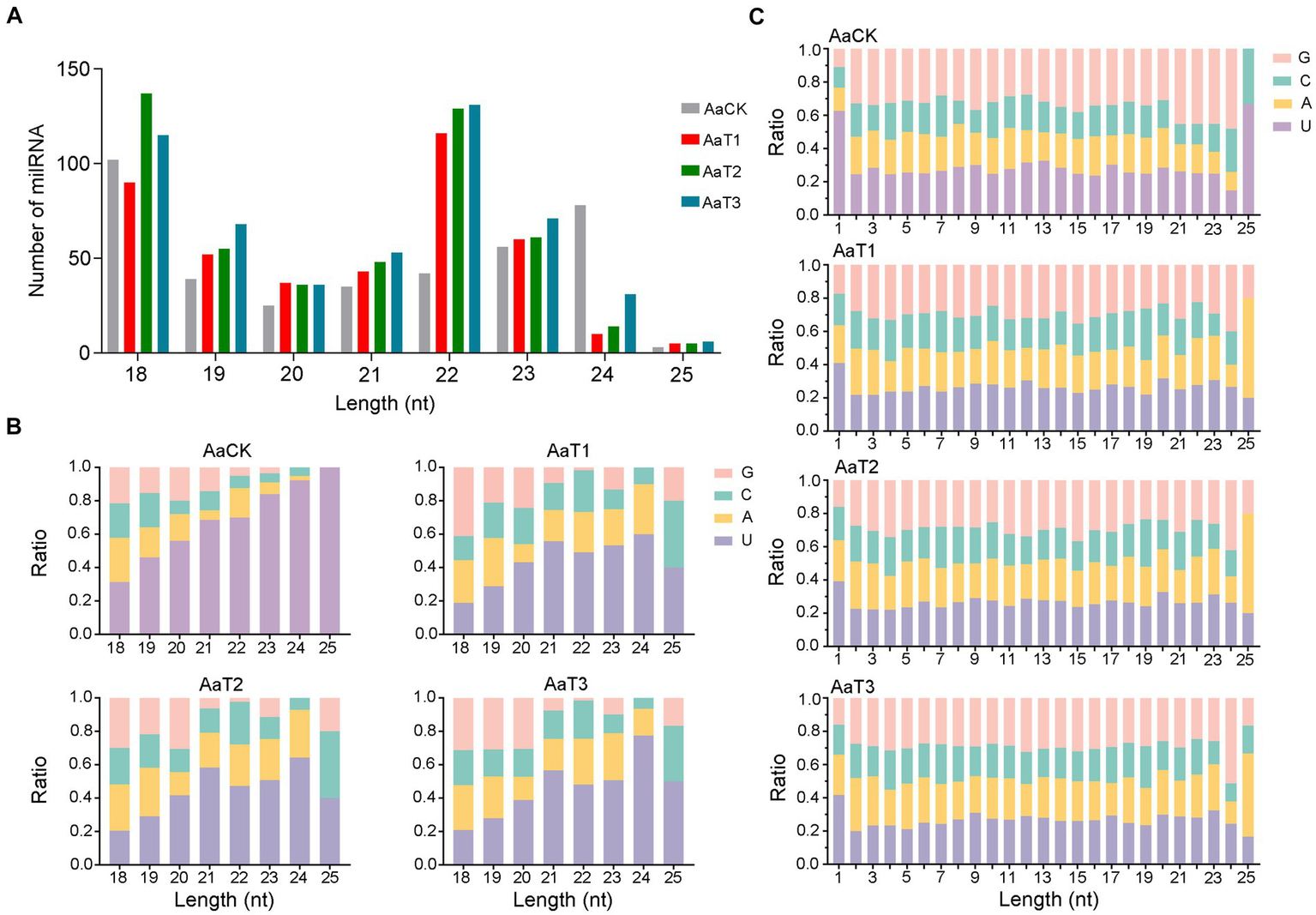 In addition, structural analysis indicated that the length distribution of the milRNAs identified in the four groups were all between approximately 18 and 25 nt (Figure 1A); the most enriched lengths of the milRNAs in the AaT1, AaT2, and AaT3 groups were 18 and 22 nt, while the milRNAs in the AaCK group were mostly distributed at 18 nt, followed by 24 nt (Figure 1A). As shown in Figure 1B, the first base of the milRNAs of different lengths in the AaCK, AaT1, AaT2 and AaT3 groups was biased to U. Moreover, the base bias of the milRNAs at each nucleotide in these four groups varied (Figure 1C).