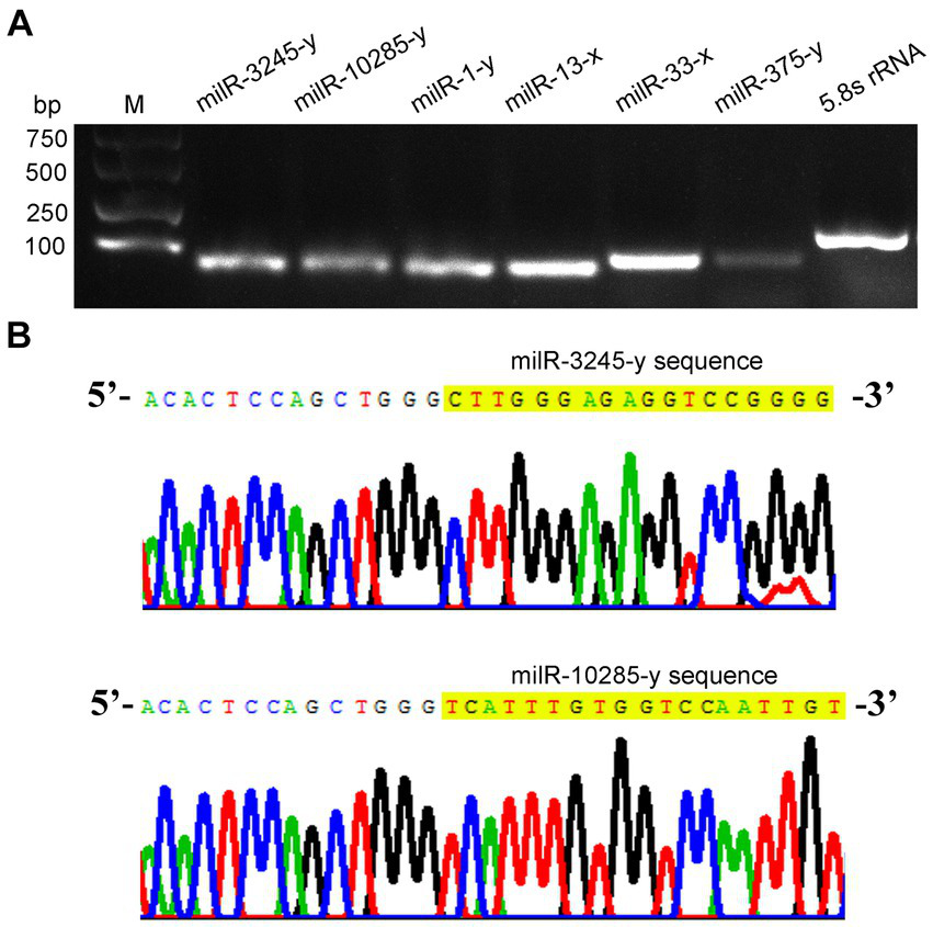 Molecular verification of A. apis milRNAs. (A) Agarose gel electrophoresis for the amplification products from stem–loop RT-PCR of six A. apis milRNAs and 5.8S rRNA; (B) Sanger sequencing of the amplified products from milR-3245-y and milR-10285-y.