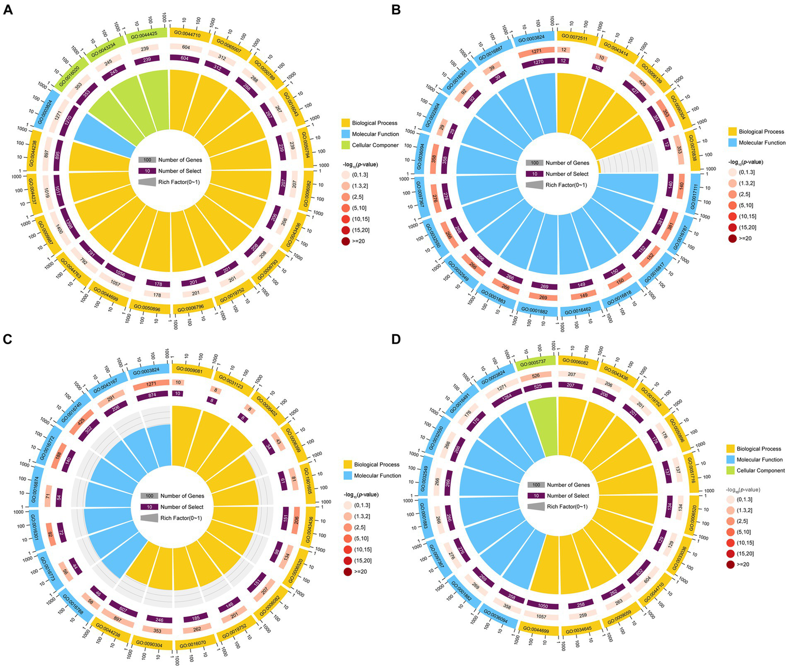 GO term analysis showed that the target mRNAs of the DEmilRNAs within the four significant profiles were involved in 42 GO terms relevant to the cellular component, molecular function, and biological process, such as the cell process, metabolic process, single organize process, catalytic activity, binding, cell, and cell membrane; additionally, 26 GO terms were significantly enriched by target mRNAs of 35 milRNAs in profile12, including nucleoside-triphosphatase activity, hydrolase activity, hydrolase activity etc. (Figure 4B); 22 GO terms were significantly enriched by target mRNAs of 27 milRNAs in profile16, including catalytic activity, transferase activity, transferring phosphorus-containing groups, etc. (Figure 4C); one GO term (cytoplasm) was significantly enriched by target mRNAs of 27 milRNAs in profile17 (Figure 4D); while no GO term was found to be significantly enriched by target mRNAs of 348 milRNAs in profile2 (Figure 4A).