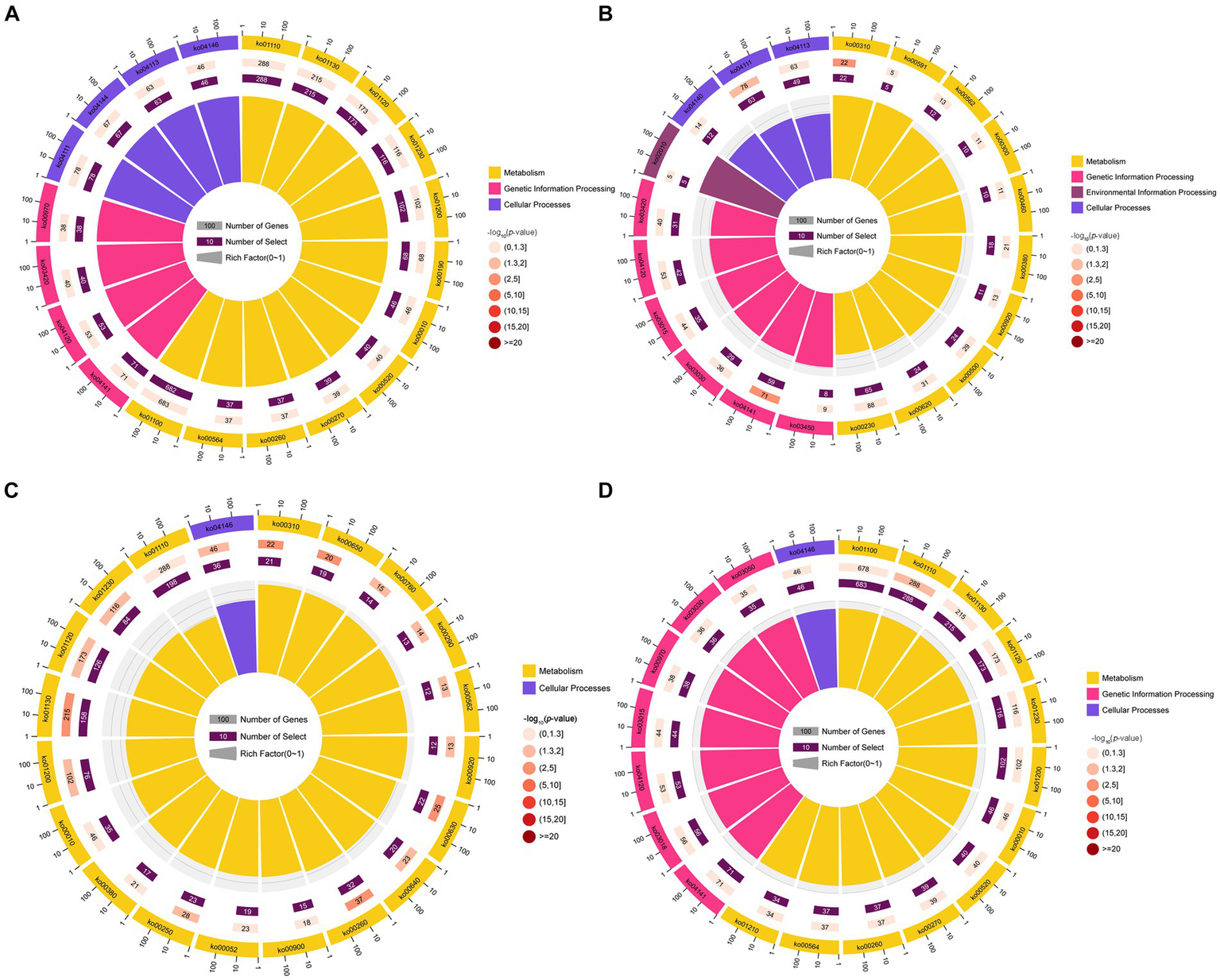 KEGG pathway analysis indicated that the target mRNAs of the DEmilRNAs within the four significant profiles were engaged in 120 KEGG pathways relative to metabolism, genetic information processing, environmental information processing, cellular processes, and organismal systems; additionally, the mRNAs targeted by the milRNAs in profile2 were significantly enriched in 120 pathways, such as metabolic pathways (ko01100) and biosynthesis of secondary metabolites (ko01110) (Figure 5A); the mRNAs targeted by the milRNAs in profile16 (upregulated and downregulated trend) were significantly enriched in 15 pathways such as lysine degradation (ko00310) and butanoate metabolism (ko00650) (Figure 5C); the target mRNAs of the milRNAs in profile12 and profile17 (upregulated trend) were enriched in 120 pathways, in which lysine degradation (ko00310), protein processing in endoplasmic reticulum (ko04141), cell cycle (ko04111), biosynthesis of secondary metabolites (ko01110) was significantly enriched (Figures 5B,D).