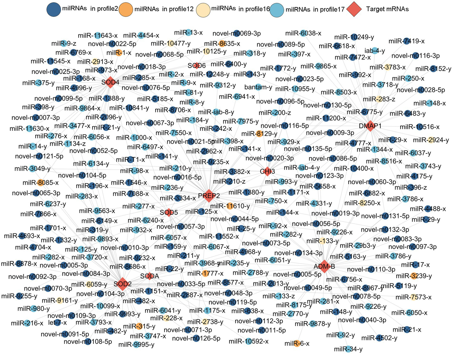 Trend analysis indicated that 1,192 A. apis milRNAs were grouped into 20 profiles, including four significant profiles (profile2, profile12, profile17, and profile16), as shown in Figure 3. In detail, 348, 258, 35, and 27 milRNAs were included in profile2, profile17, profile12, and profile16, respectively. Targeting prediction suggested that 112, 35, 258, and 6 milRNAs within profile2, profile12, profile16, and profile17 could, respectively, target 120,031, 9,653, 8,758, and 82,999 mRNAs (Supplementary Table 2).