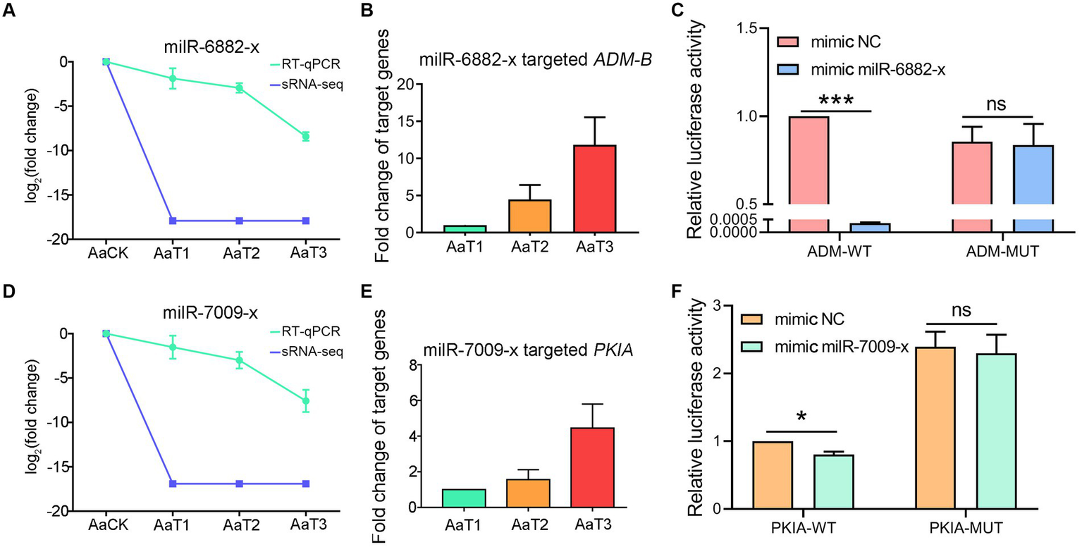 A. apis milRNAs target ADM-B and PKIA. (A,D) Relative expression level of milR-6882-x; (B) Relative expression level of ADM-B; (C) Dual-luciferase reporter assay of HEK293T cells co-transfected with milR-6882-x and pmirGLO vector containing target sequences of ADM-B; (D) Relative expression level of milR-7009-x; (E) Relative expression level of PKIA; (F) Dual-luciferase reporter assay of HEK293T cells co-transfected with milR-7009-x mimic and pmirGLO vector containing target sequences of PKIA.