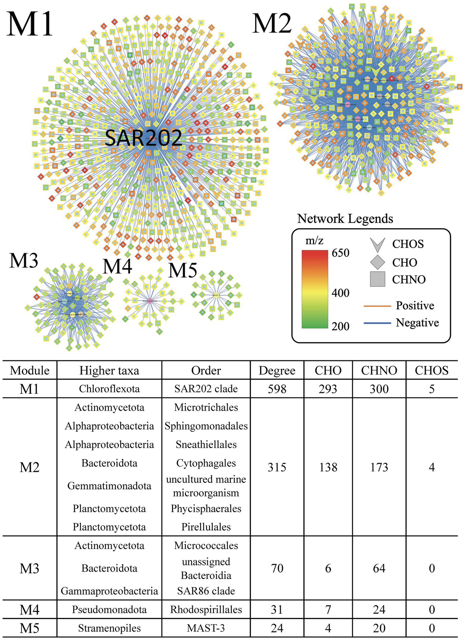 Extracted networks showing the statistically significant positive correlations between order-level taxa and SAR202-associated molecular formulae in the treatment incubation during phase 1 (day 0–30). Network legends are identical to that of Figure 2.
