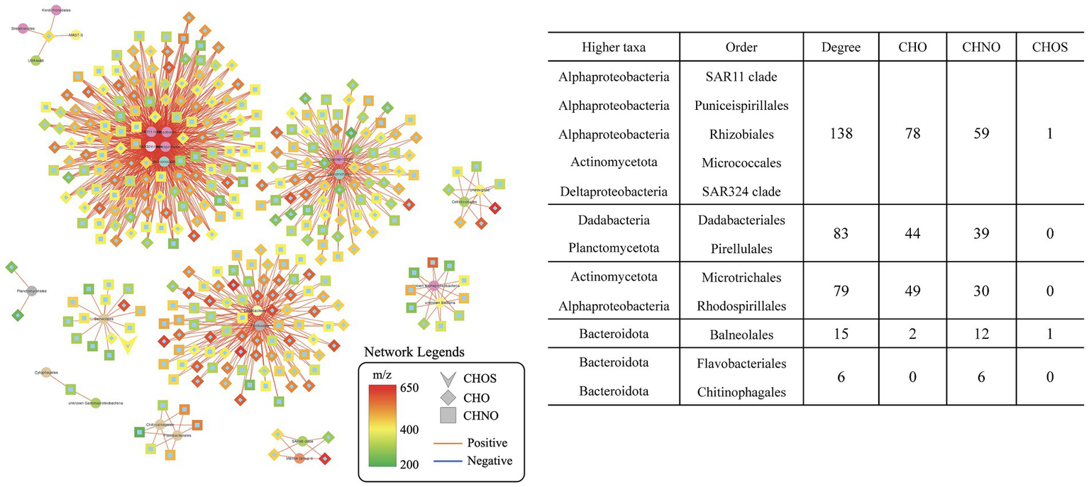 Correlation-based network analysis is valuable for data mining and visualization in silico analysis of large datasets (Batushansky et al., 2016), and it can provide insights into the dynamics of microbial community structures (Cardona et al., 2016). Several incubation studies have used network analysis to illustrate complex relationship between microbial taxa and DOM molecules based on 16S rRNA gene sequences and ultra-high resolution mass spectrometry data (Luria et al., 2017; Zhou et al., 2018; Zhao et al., 2019; Xiao et al., 2021; Zhou et al., 2021; Raina et al., 2022; Wang et al., 2022). Based on the same incubation experiment (coastal water) used by Xie et al. (2020), Wang et al. (2022) reported that the OTUs from the SAR202 clade had a relatively high degree of associations with DOM in the later stage of incubation, yet no detailed relationships between individual SAR202 groups and molecular formulae were explored and the role of SAR202 was only briefly mentioned. Furthermore, molecular properties of SAR202-associated DOM have not been explored.