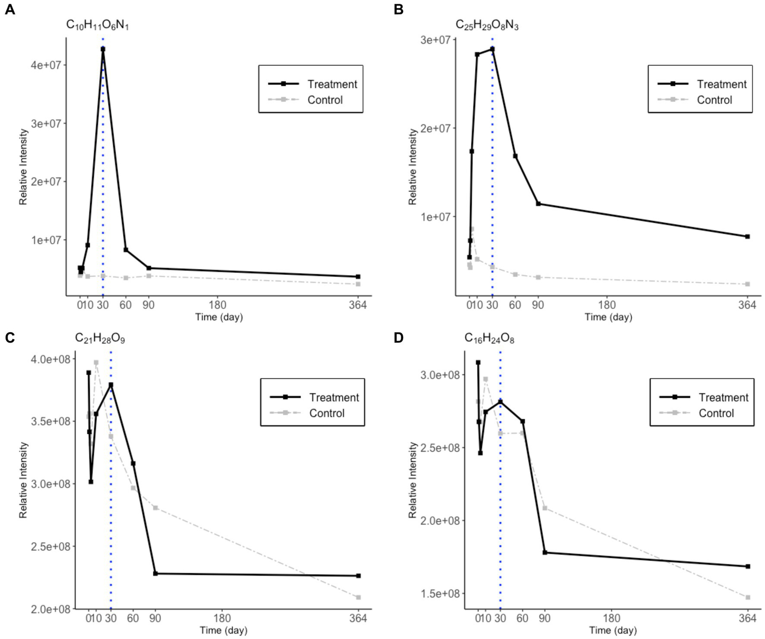 Changes in relative intensity values for 2 CHNO (A,B) and 2 CHO (C,D) representative molecular formulae during the one-year incubation. The treatment values are in black solid lines and the control values are in gray dashed lines. A blue dotted line is drawn on day 30 to indicate the break point between phase 1 and 2.