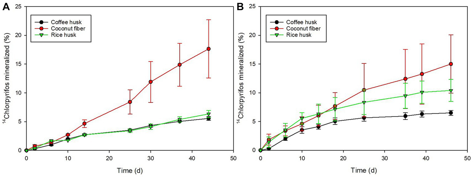 Mineralization of 14C-chlorpyrifos represented as % 14CO2 evolved from the biomixtures over a period of 44–46 days. Biomixtures containing the mixture of 12 pesticide formulations (A); biomixtures containing only the chlorpyrifos formulation (B). Biomixtures: coffee husk (black circles), coconut fiber (red circles), and rice husk (green inverted triangles).