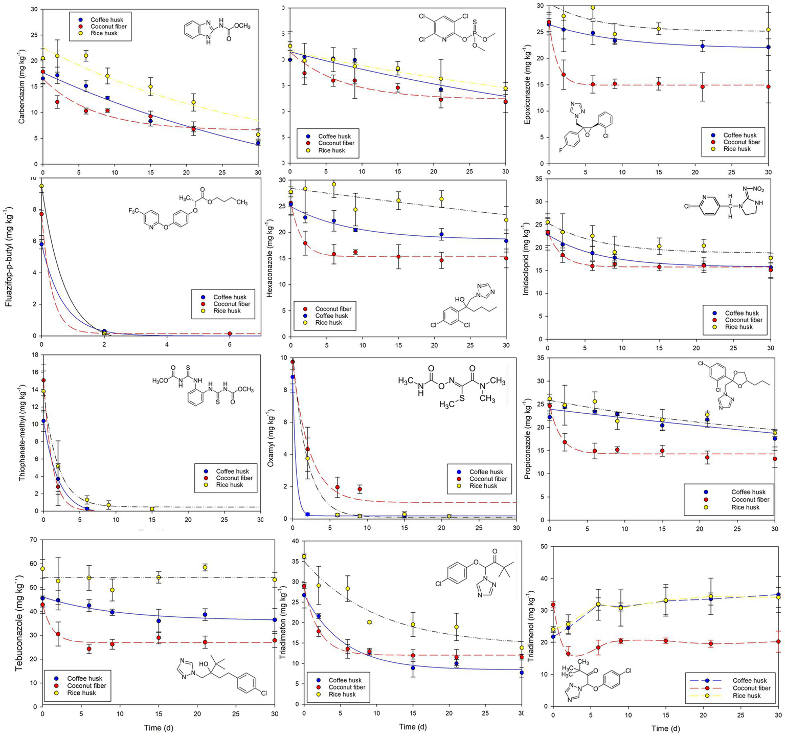 Removal profiles of a mixture of 12 pesticide formulations in biomixtures containing either coffee husk, coconut fiber or rice husk as the lignocellulosic substrate, during a period of 30 d. Values plotted are means ± SD for triplicate systems.