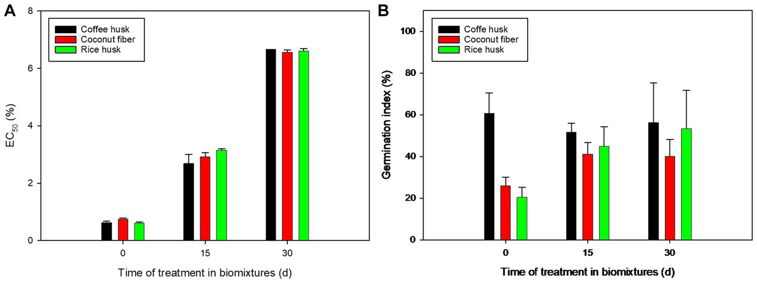 Elutriates obtained from biomixture samples were prepared according to the protocol EPA-823-B-01-002 (US EPA, 2001), by adding 40 mL distilled water to 10 g samples followed by mechanical shaking (1 h) and centrifugation (10 min at 3500 rpm). The immobilization test in D. magna was performed as described by Lizano-Fallas et al. (2017). Briefly, ten daphnid neonates (triplicates) were exposed to 10 mL of elutriate dilutions in moderately hard reconstituted water (21 ± 1°C for 48 h); immobility of neonates was determined and assumed as equivalent to mortality. The relative concentration of the sample that resulted in 50% of immobilization in the daphnids (EC50) was calculated using Python 3.9.