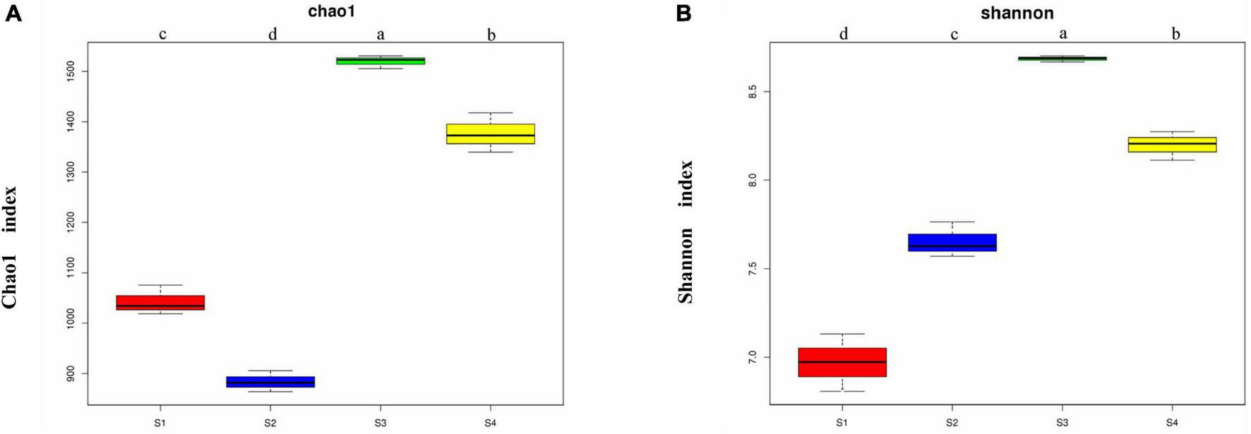 Chao1 indexes (A) and Shannon indexes (B) of the bacterial communities from the rhizosphere of Suaeda glauca at different sampling sites. S1, desert grassland; S2, waterfront wild grassland; S3, wild grassland near farmland; and S4, wild grassland near grazing land. The horizontal bars within boxes represent medians. The tops and bottoms of boxes represent the 75th and 25th percentiles, respectively. The upper and lower whiskers extend to data no more than 1.5 × the interquartile range from the upper and lower edges of the box, respectively.
