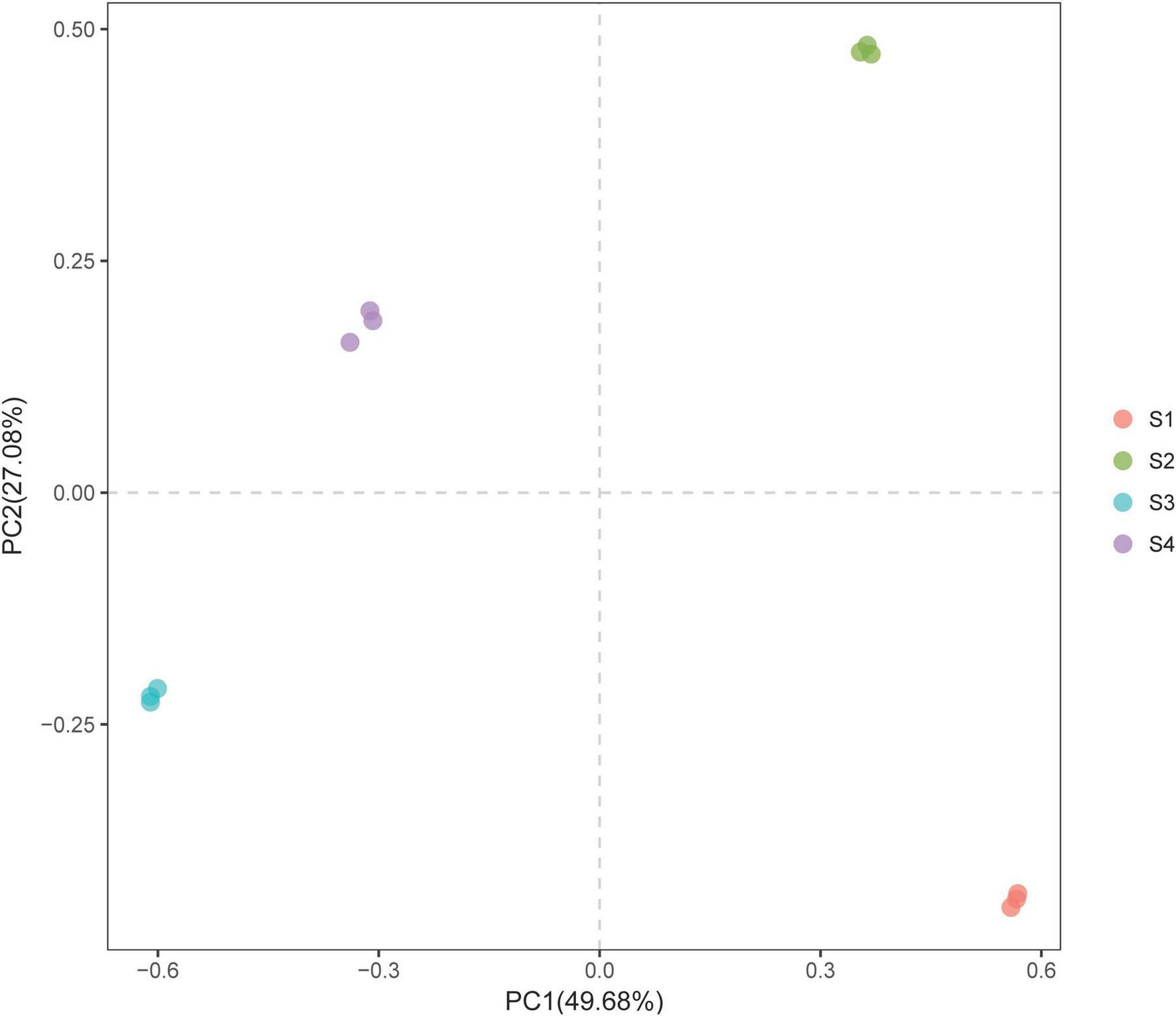 PCA plot of the bacterial communities in the rhizosphere soils of S. glauca at different sampling sites.