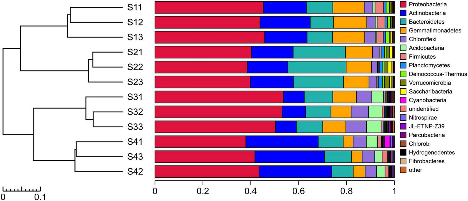 The experimental results showed that more than 99.67% of the species in the bacterial communities subjected to the different treatments could be classified to the phylum level (Figure 4). The top five dominant bacterial phyla in all the different treatments were Proteobacteria, Actinobacteria, Gemmatimonadetes, Bacteroidetes and Chloroflexi. Notably, Proteobacteria was the most abundant phylum in all the treatments, with relative abundances of 39.55–52.34%, but the relative abundance of dominant species differed among the treatments. The relative abundance of Actinobacteria decreased in the S3 plots compared with other treatments, and the bacterial taxa of Proteobacteria, Acidobacteria and Chloroflexi exhibited the opposite pattern. The relative abundance of Bacteroidetes was higher in the S2 plots than in the other treatments. Compared with the other treatments, Gemmatimonadetes and Firmicutes were found at a greater relative abundance in the S1 treatment. In addition to the abovementioned dominant phyla, the species with high abundance at the phylum level mainly included Acidobacteria, Firmicutes, Planctomycetes, Deinococcus-Thermus, Verrucomicrobia, Saccharibacteria, Cyanobacteria, Nitrospirae, JL-ETNP-Z39, Parcubacteria and Chlorobi, and these 16 populations accounted for 99.31% of the total bacterial communities.