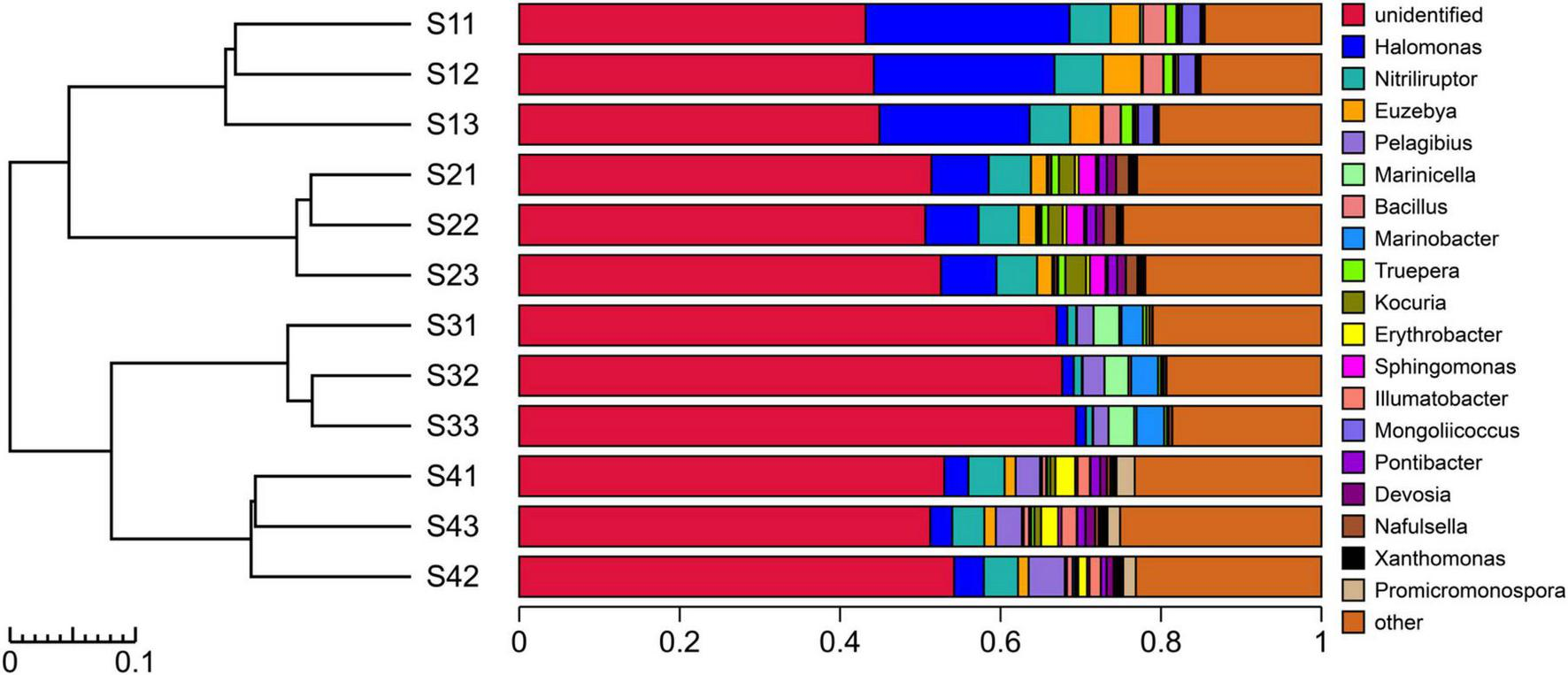 At the genus level, the main bacterial markers in the S1 plots were Halomonas, Nitriliruptor, Euzebya, Bacillus and Mongoliicoccus, where those in the S2, S3 and S4 plots included Kocuria, Marinobacter, and Pelagibius, respectively.