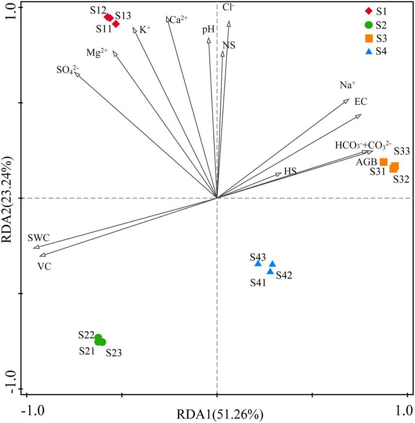 The RDA indicated that environmental factors exerted strong influences on the rhizosphere bacterial community and explained 51.26% and 23.24% of the community variances between samples, respectively. However, the main influencing factors of rhizosphere bacterial community were different in different treatments. As shown in Figure 7, the bacterial community was mainly affected by K+, Ca2+ SO42–and Mg2+ in the S1 treatment; by VC and SWC in the S2 treatment; by HS, AGB, HCO3–+CO32–, pH, Na+ and EC in the S3 treatment; and by Mg2+, SO42–, K+ and Ca2+ in the S4 treatment.