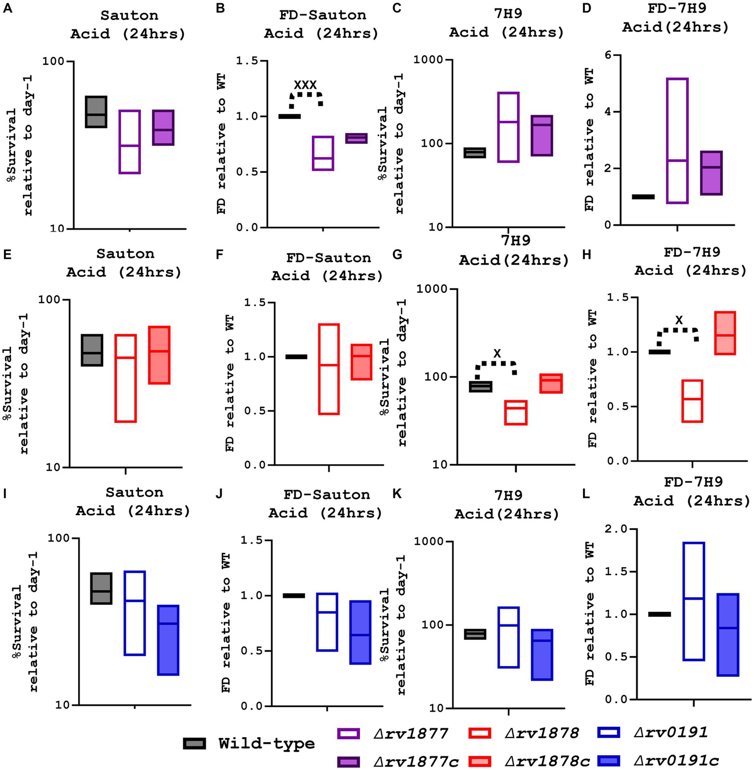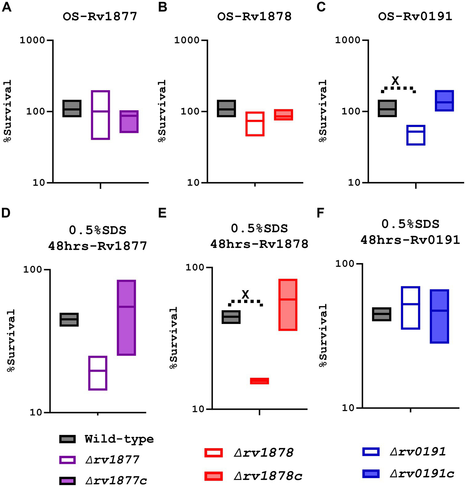 The ∆rv1877 mutant was sensitive to Spm stress, while the ∆rv0191 mutant was not. On the other hand, the ∆rv1878 mutant grew better than the wild-type during iron starvation yet was sensitive to cell wall stress. The proteins Rv1877 and Rv1878 seemed to play physiological roles during hypoxia and acidic stress. Lastly, the ∆rv0191 mutant was the only mutant that was sensitive to oxidative stress.