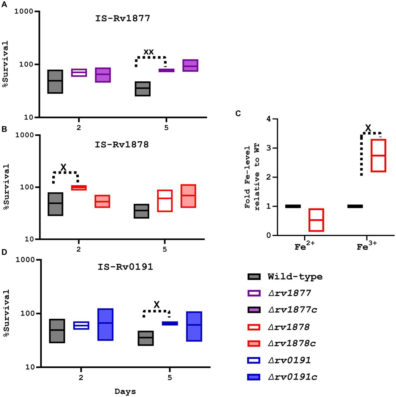 Susceptibility tests were performed as follows. Logarithmic phase cultures in Sauton’s media were adjusted to an OD600 of 0.2 (cultured without agitation in vented tissue culture flasks). This was washed several times in sterile 1X PBS (phosphate buffer saline, prepared from 10X Gibco™ DPBS, without calcium and magnesium; +0.6% tyloxapol). Then a 100-fold dilution was performed, either in PBS, or in 0.5% SDS, or in acidified 7H9, or Sauton’s (pH ~5) or in the iron-deprived (IS) media prepared as previously described (Kurthkoti et al., 2017) with slight modifications as follows. A volume of 425 mL of distilled water was added to a mixture of 2.5 g Asparagine +2.5 g potassium phosphate dehydrate +20 mL glycerol. Then the pH was adjusted with sodium hydroxide to 6.8. Next, 20 g of Chelex® 100 (Sigma Adrich, chelates metal) was added to the mixture which was incubated overnight at 4°C. The following day, the media was filtered and 5 μL of sterile (previously prepared and stored at −20°C) 50 mg/mL ZnCl2, 50 mg/mL MnSO4 and 50 mg/mL MgSO4 each, were added to the media. The final IS media was supplemented by adding 50 mL of sterile 10X ADS and 1.3 mL of 20% filtered sterilized tyloxapol. The mycobacteria resuspended to desired bacterial density in various media, were aliquoted (2 mL) in 12-well plates, and incubated at 37°C. Aliquots were collected at various time points and plated accordingly for CFUs determination. Percentage survivals were derived relative to the CFUs obtained from day-1 of the experiment. Similarly, for anaerobic experiments, cultures resuspended in Sauton’s media-Tyl and aliquoted in 96-well plates were incubated in hypoxic conditions (without agitation) using the Anaerogen Gas Pack System (Thermo Fisher) as previously described (Tan et al., 2010). Shortly, after the mycobacterial plates were sealed with micropore tapes, they were placed in the Thermo Scientific™ Oxoid Anaerobic 2.5 L Rectangular Jar, then the pouch from the Thermo Scientific™ Oxoid AnaeroGen 2.5 L anaerobic gas generating sachet was quickly placed in the reserved chamber of the jar/container, which was rapidly sealed and incubated at 37°C. In addition, the Thermo Scientific™ Oxoid™ Resazurin Anaerobic Indicator was removed from its sachet and quickly stuck to the internal wall of the container (before it was sealed) to visually monitor depletion of oxygen by its color change from pink to white. Moreover, before the actual experiment, an oxygen measuring device (portable oxygen meter, Brand: Rrunzfon, Tyle: Industrial), was used to measure the level of oxygen in the system over time to ensure that the system was depleting oxygen to hypoxia levels. The CFUs after 48 h of incubation in hypoxia were normalized to the initial CFUs (day-1) to obtain the percentage survival.