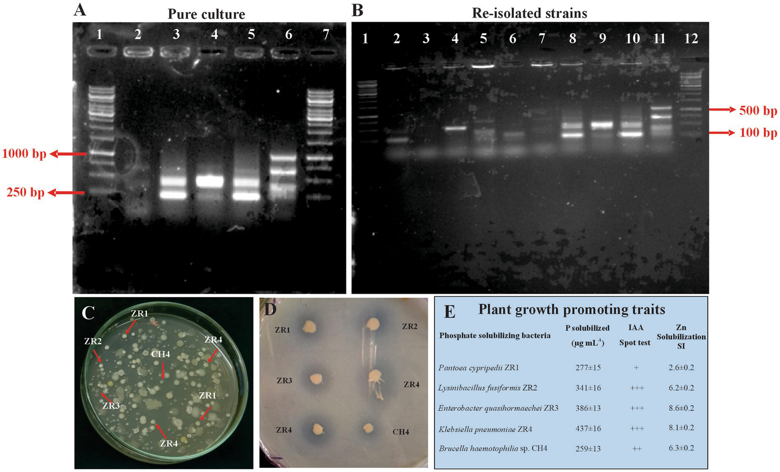 Figure 5. Re-isolation of inoculated PSB colonies. Photograph of gel indicates BOX-PCR patterns of pure culture of PSB from wheat rhizosphere, 1: 1Kb DNA ladder; 2: ZR1, 3: ZR2, 4: ZR3, 5: ZR4, 6: CH4 (A). Photograph of gel indicates re-isolated colonies of PSB that are morphologically similar to the inoculated consortium-2 PSB, 1: 1Kb DNA ladder, 2–5: Non-specific colony, 6: Re-isolated ZR1 colony, 7: Re-isolated ZR2 colony, 8: Re-isolated ZR3 colony, 9: Re-isolated ZR4 colony, 10: Re-isolated CH4 colony, 11: Non-specific colony (B). Plate showing re-isolated colonies of ZR1, ZR2, ZR3, ZR4, and CH4 (C). NBRIP Plate showing solubilization zones formed by re-isolated colonies of ZR1, ZR2, ZR3, ZR4, and CH4 (D). Plant growth-promoting attributes of re-isolated PSB strains for the confirmation of inoculated PSB: P solubilization was detected quantitatively by the molybdenum blue method, IAA production indicated by pink coloration upon reaction with Salkowski’s reagent, and Zinc solubilization was confirmed by the formation of halo zone on an agar plate added with ZnO. Values are an average of three biological replicates (E).