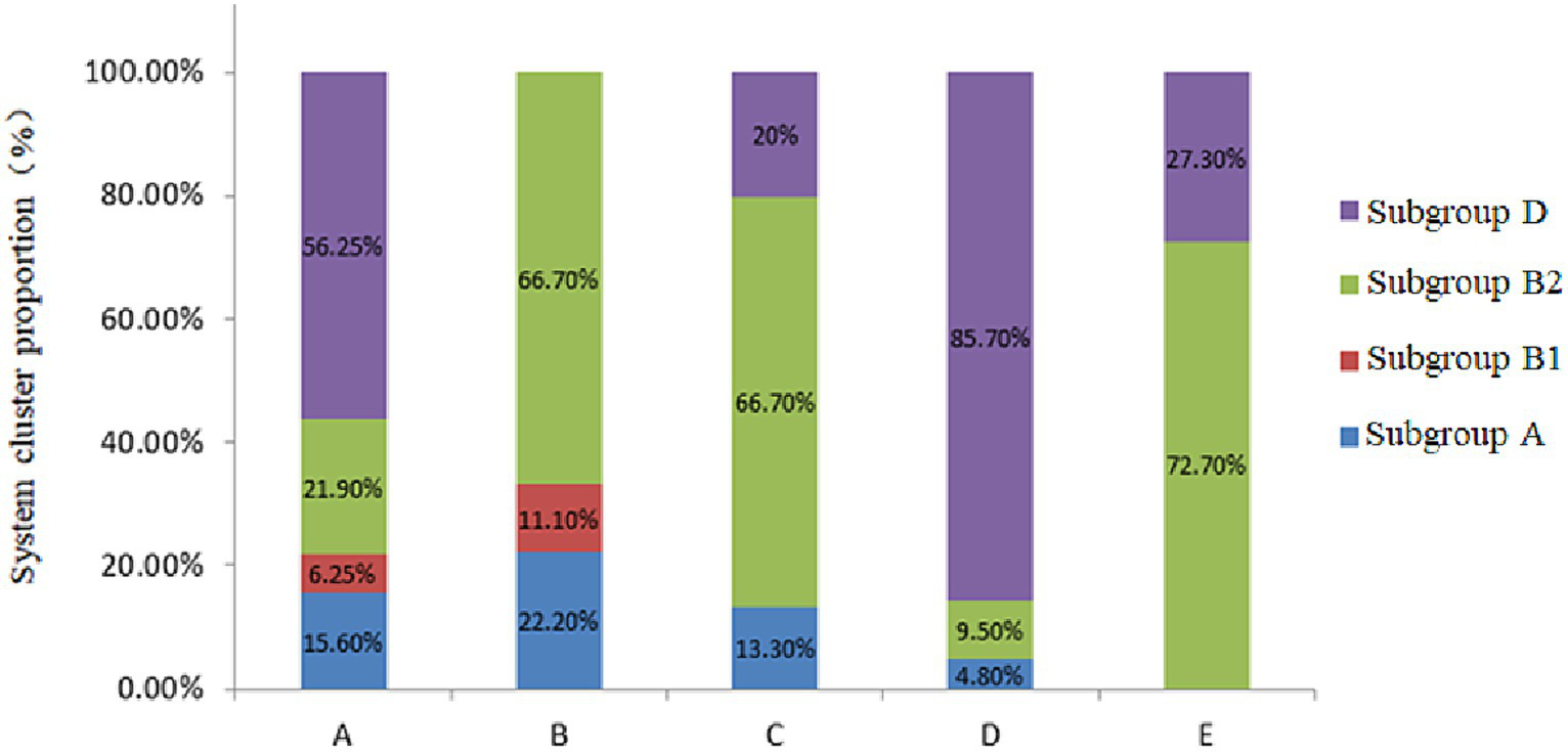 Phylogenetic clustering was performed using multiple PCR targeting DNA fragments of genes chuA, yjaA, and TspE4-C2 to distinguish the four phylogenetic clusters A, B1, B2, and D. The specific phylogenetic clustering methods are indicated in Table 1 (Clermont et al., 2013; Nowrouzian et al., 2019). The primers of related gene fragments are depicted in Table 2. The 50 μL PCR reaction system comprised the following: 25 μL Premix TaqTM (TaKaRa TaqTM Version 2.0 plus dye), 2 μL template, 1 μL upstream and downstream primers, add ddH2O to 50 μL. Amplification conditions was as follows: pre-denaturation at 94°C for 5 min; 30 cycles of denaturation 94°C for 30s, annealing at 58°C for 45 s, and extension at 72°Cfor 90s; extension at 72°C for 10 min. Subsequently, E. coli was categorized based on the band size after electrophoresis.