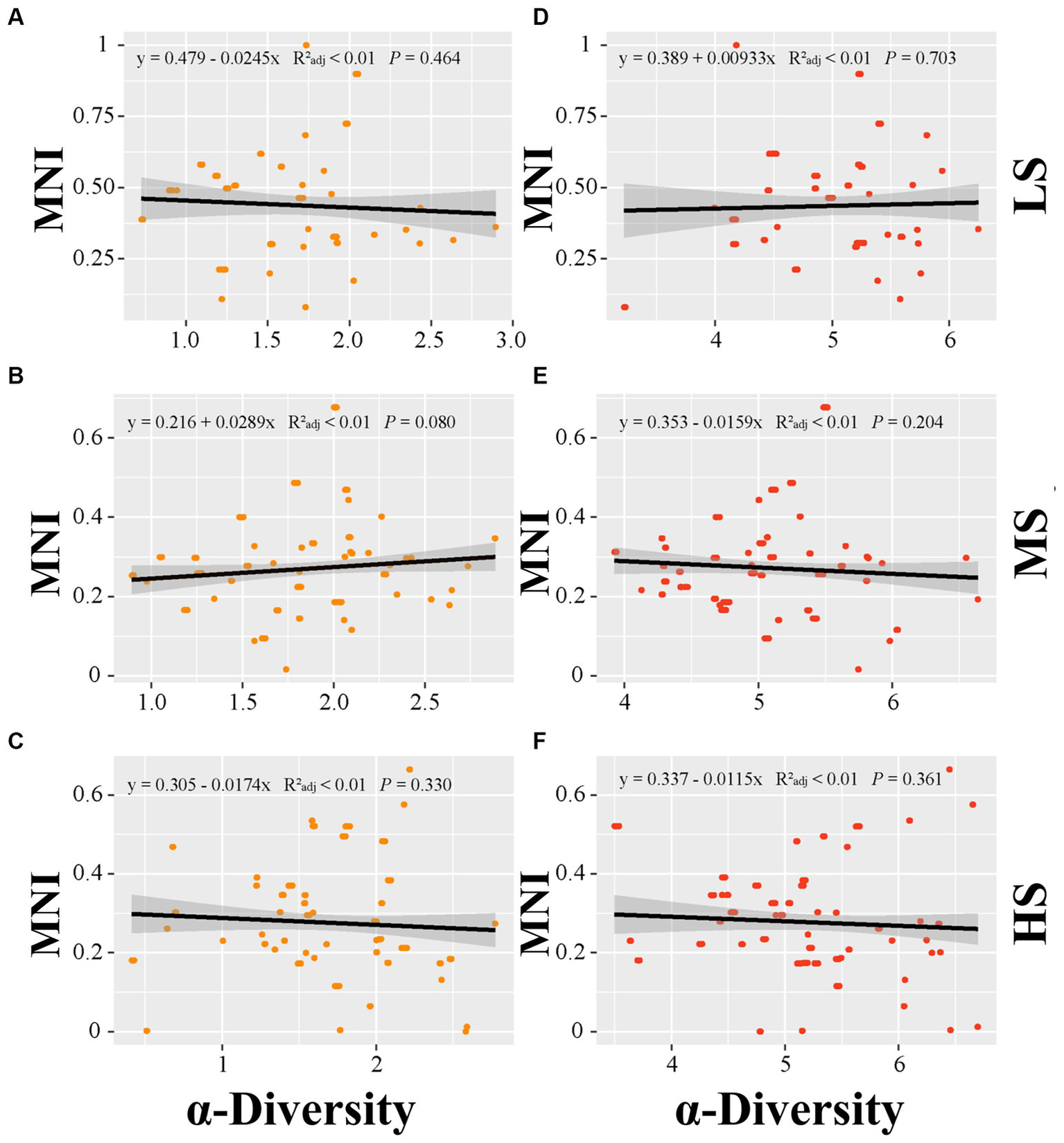 Linear regressions for α-diversity of abundant (A–C) and α-diversity of rare marine bacterioplankton communities (D–F) with EMF in different salinity gradients. LS, low salinity; MS, medium salinity; HS, high salinity; MNI, multi-nutrients cycling index.