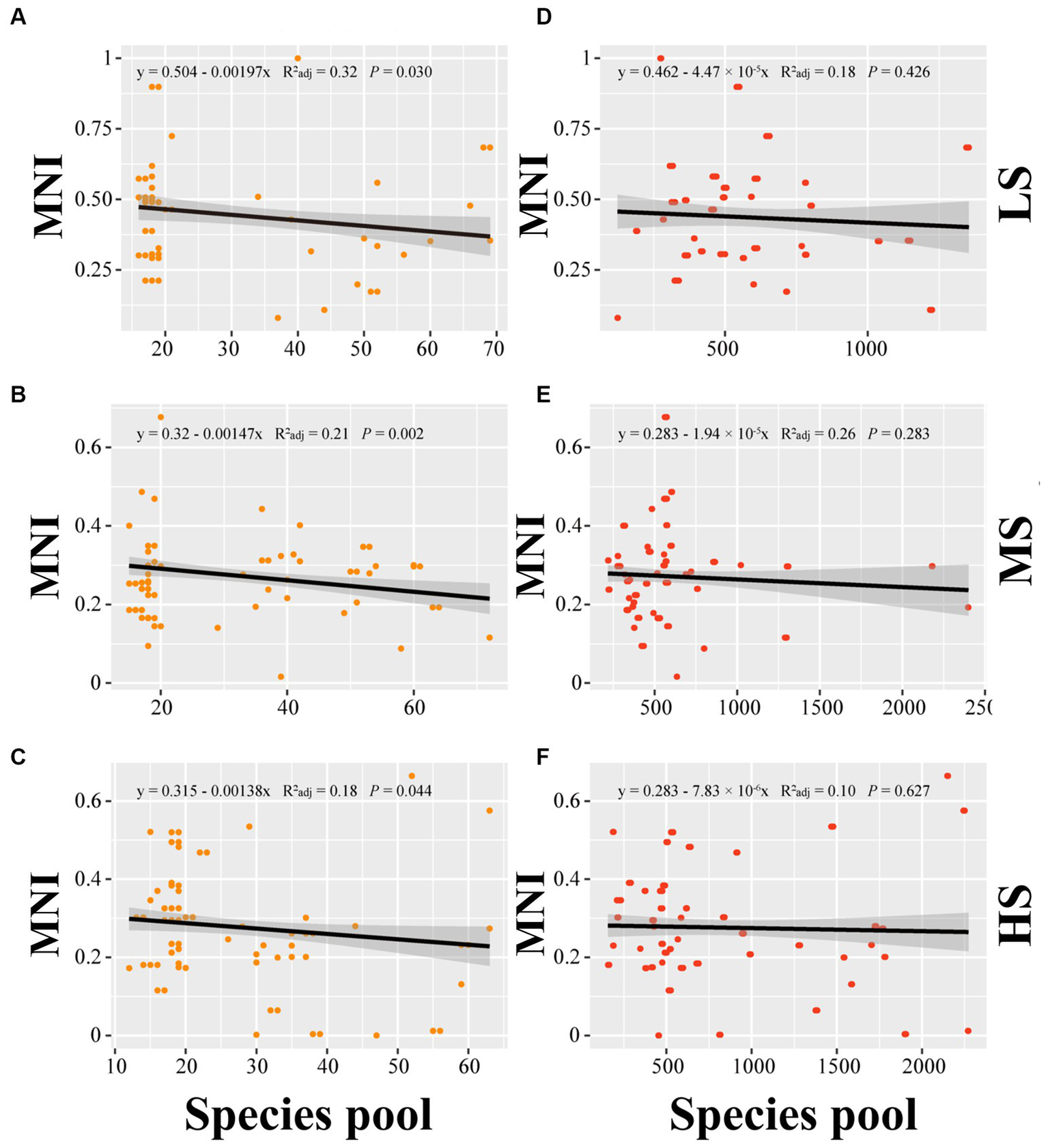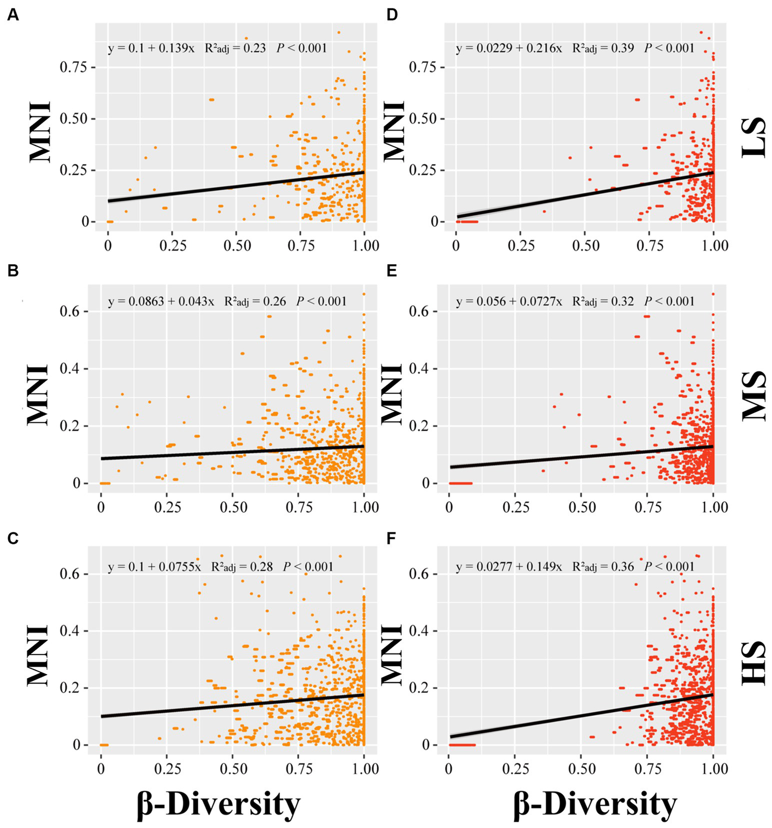 Linear regression analysis was employed to establish the relationship of MNI to alpha diversity, beta diversity and species pools in abundant and rare areas. In terms of alpha diversity, the linear regression analysis indicated no significant correlation between alpha diversity and MNI in abundant and rare taxa (p > 0.05) (Figure 3). For beta diversity, the linear regression analysis demonstrated that MNI showed a significantly positive correlation with beta diversity of abundant and rare taxa in LS, MS, and HS samples (p < 0.001). Compared to abundant taxa, the beta diversity of rare taxa showed a stronger influence on the EMF (Figure 4). Moreover, compared with MS and HS samples, the beta diversity of rare taxa in the LS group had a stronger linear correlation with MNI (Figure 4). The results in Figure 5 show that MNI was significantly negatively correlated with the species pool in the LS, MS, and HS samples in the abundant subcommunity (p < 0.05). However, there was no significant relationship between the species pool and MNI in the LS, MS, and HS samples of rare taxa (p > 0.05) (Figure 5).