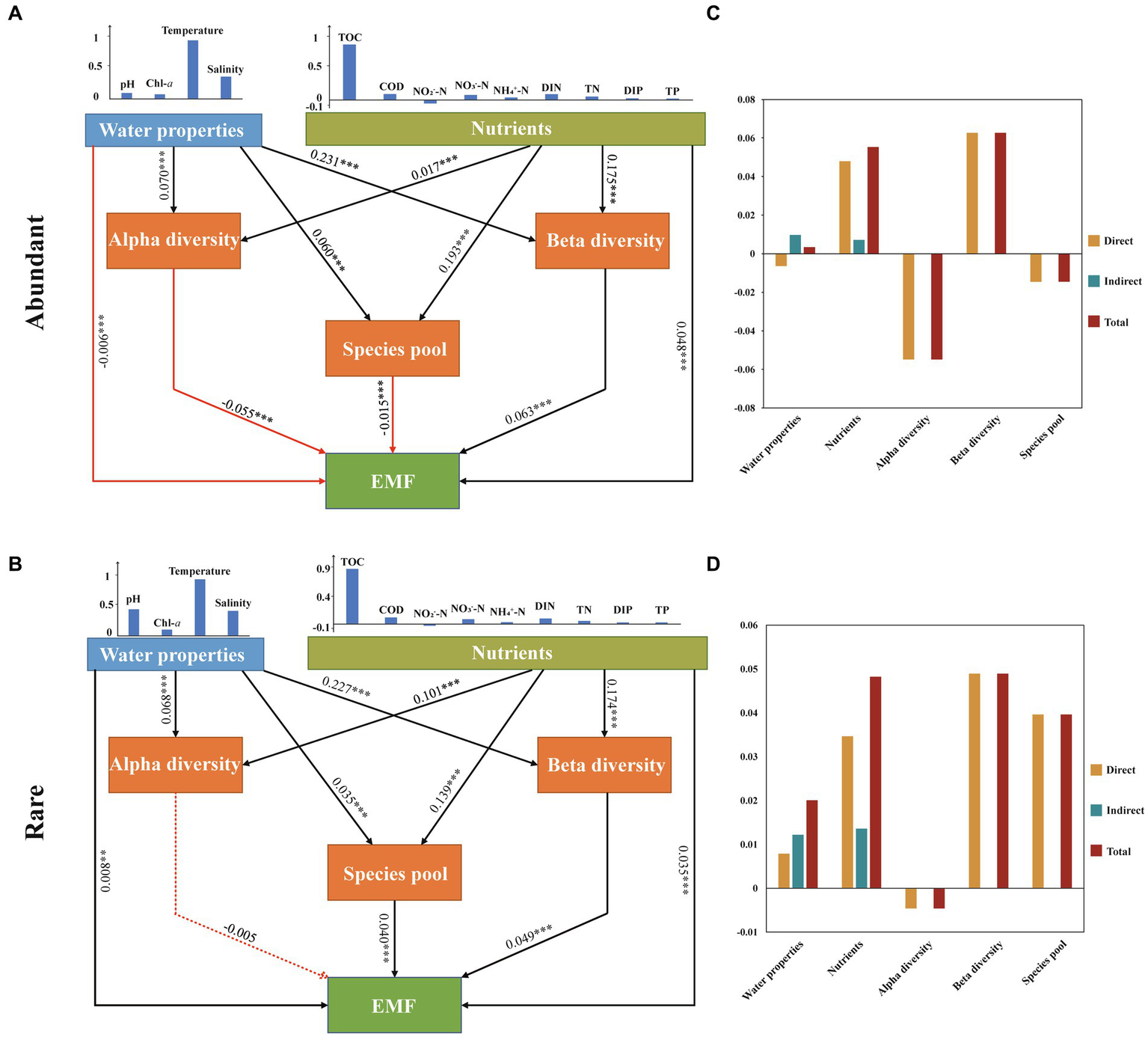 Partial least-squares path modelling (PLS-PM) analysis showing the multiple effects of environmental (water properties and nutrient parameters) factors and biotic (bacterioplankton community diversity and species pool) factors on EMF in marine ecosystems and the path coefficients between different factors and their corresponding latent variables of abundant (A) and rare (C) and their standardized direct, indirect and total effects of abundant (B) and rare (D). Water properties include temperature, salinity, pH, and Chl-a. Nutrients include C (TOC, COD), N (NO3−-N, NO2−-N, NH4+-N, DIN, TN), and P (DIP, TP). Red arrows represent negative correlations, and blue arrows represent positive correlations. The solid arrow represents significant correlations (the number is the R value; the asterisk indicates the p value: *p < 0.05, **p < 0.01, and ***p < 0.001), and the dotted arrow represents nonsignificant correlations (p > 0.05).