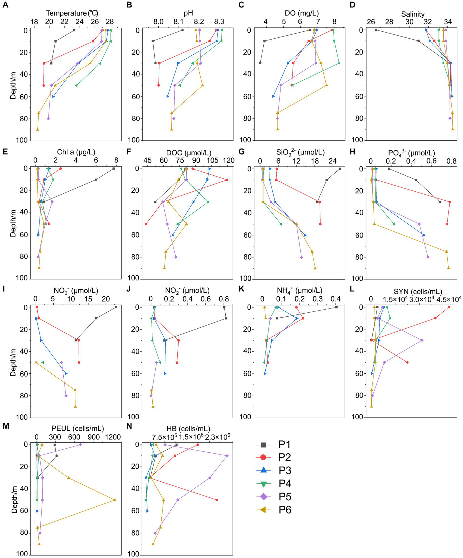 Environmental parameters along the PN section in summer. (A) Temperature; (B) pH; (C) DO; (D) Salinity; (E) Chl a, Chlorophyll a; (F) DOC; (G) SiO32-; (H) PO43-; (I) NO3-; (J) NO2-; (K) NH4+; (L) SYN, Synechococcus; (M) PEUL, picoeukaryotes; (N) HB, heterotrophic bacteria.