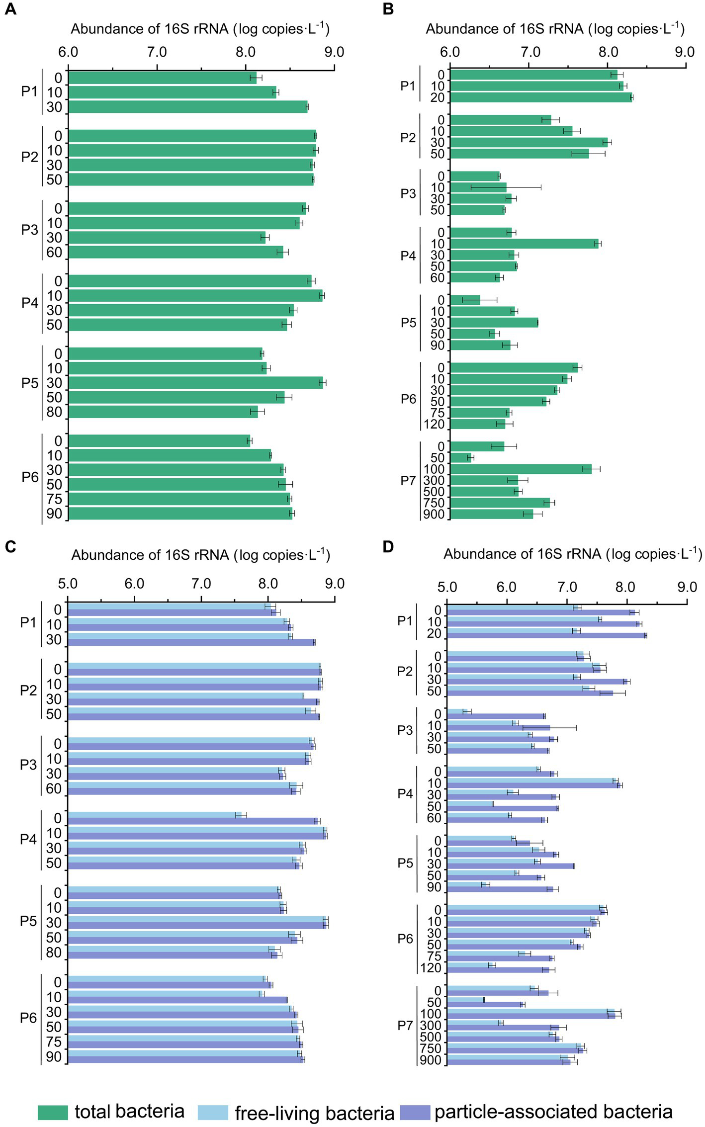 The abundance of bacterial 16S rRNA genes in the PN section during summer and winter. (A) Total bacterial 16S rRNA gene abundance in summer; (B) total abundance of bacterial 16S rRNA gene in winter; (C) free-living and particle-associated bacterial 16S rRNA gene abundance in summer; (D) free-living and particle-associated bacterial 16S rRNA gene abundance in winter.