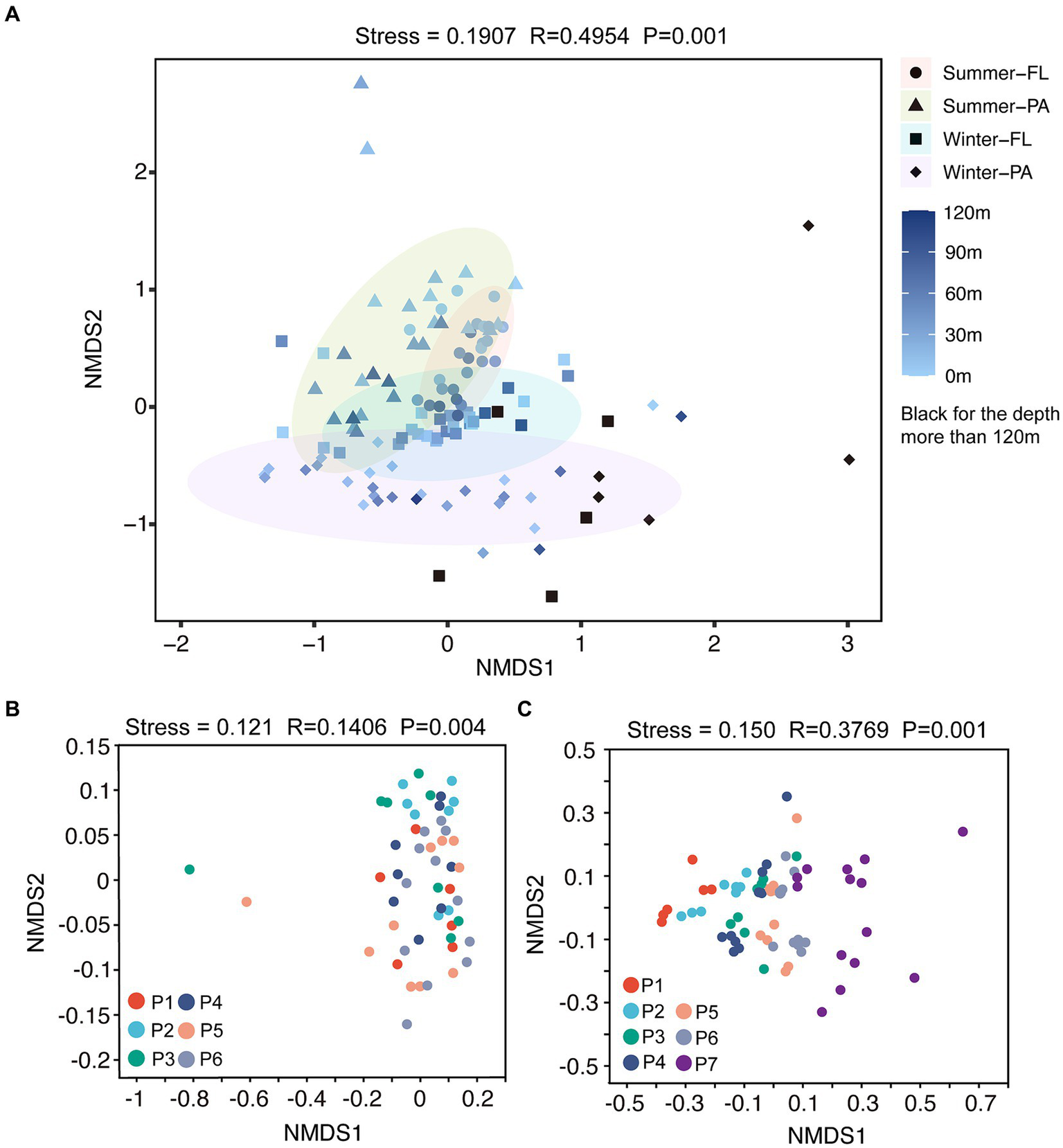 NMDS analysis on OTU level along the PN section. FL, Free-living; PA, Particle-associated. (A) NMDS analysis of all samples from summer and winter; (B) NMDS analysis of summer samples; (C) NMDS analysis of winter samples.