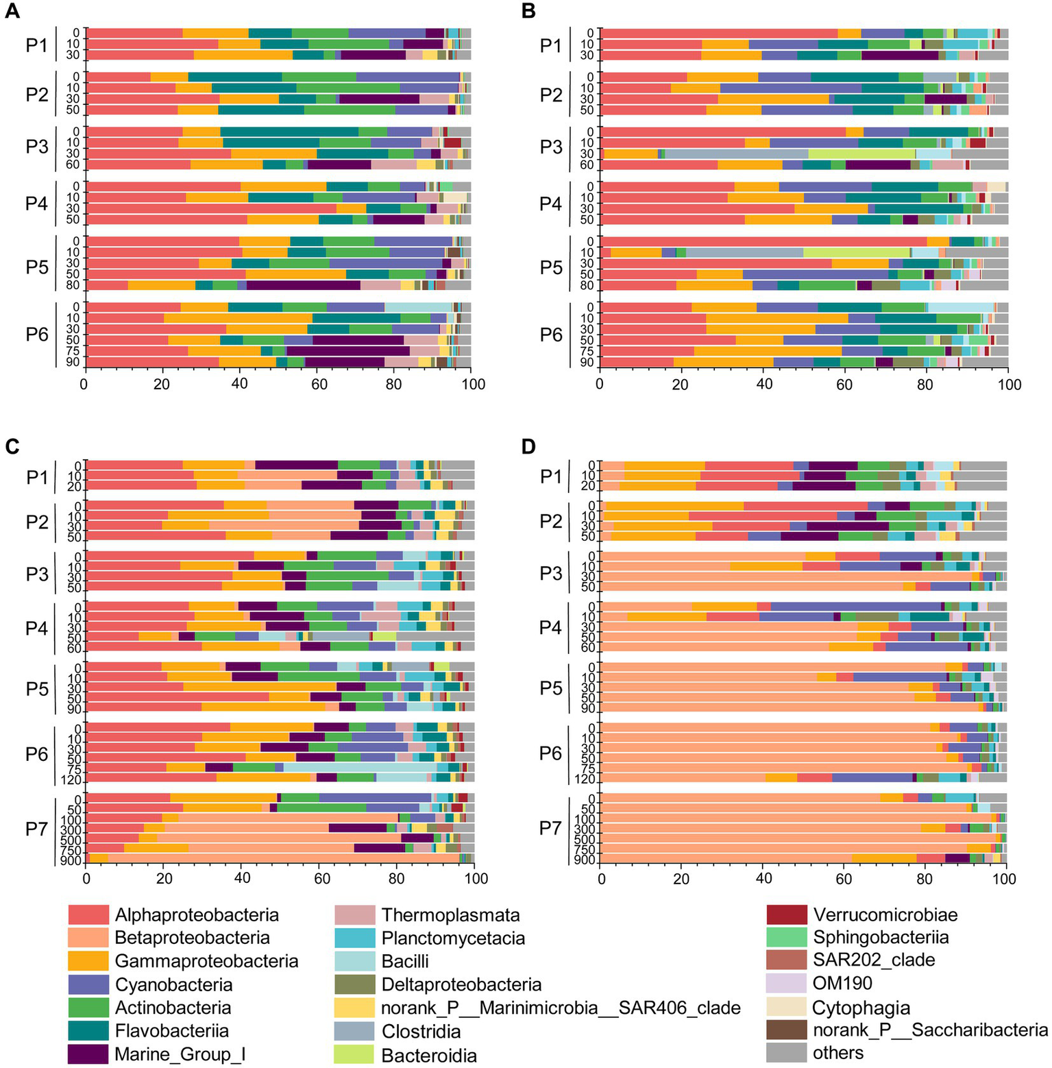 Microbial communities along the PN section during summer and winter (in class level). (A) Free-living communities in summer; (B) particle-associated communities in summer; (C) Free-living communities in winter; (D) particle-associated communities in winter.