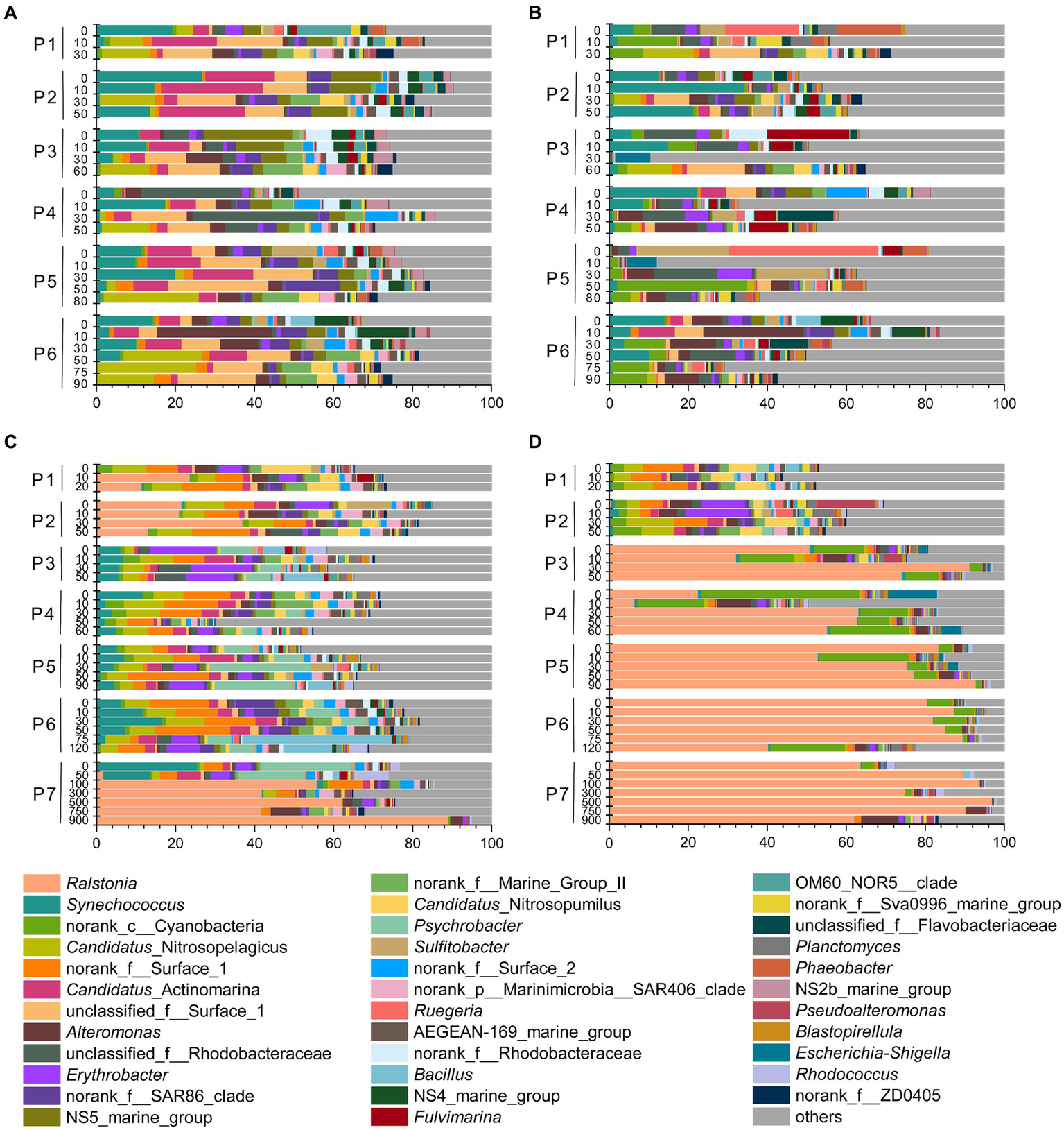 Microbial communities along the PN section during summer and winter (in genus level). (A) Free-living communities in summer; (B) particle-associated communities in summer; (C) free-living communities in winter; (D) particle-associated communities in winter.