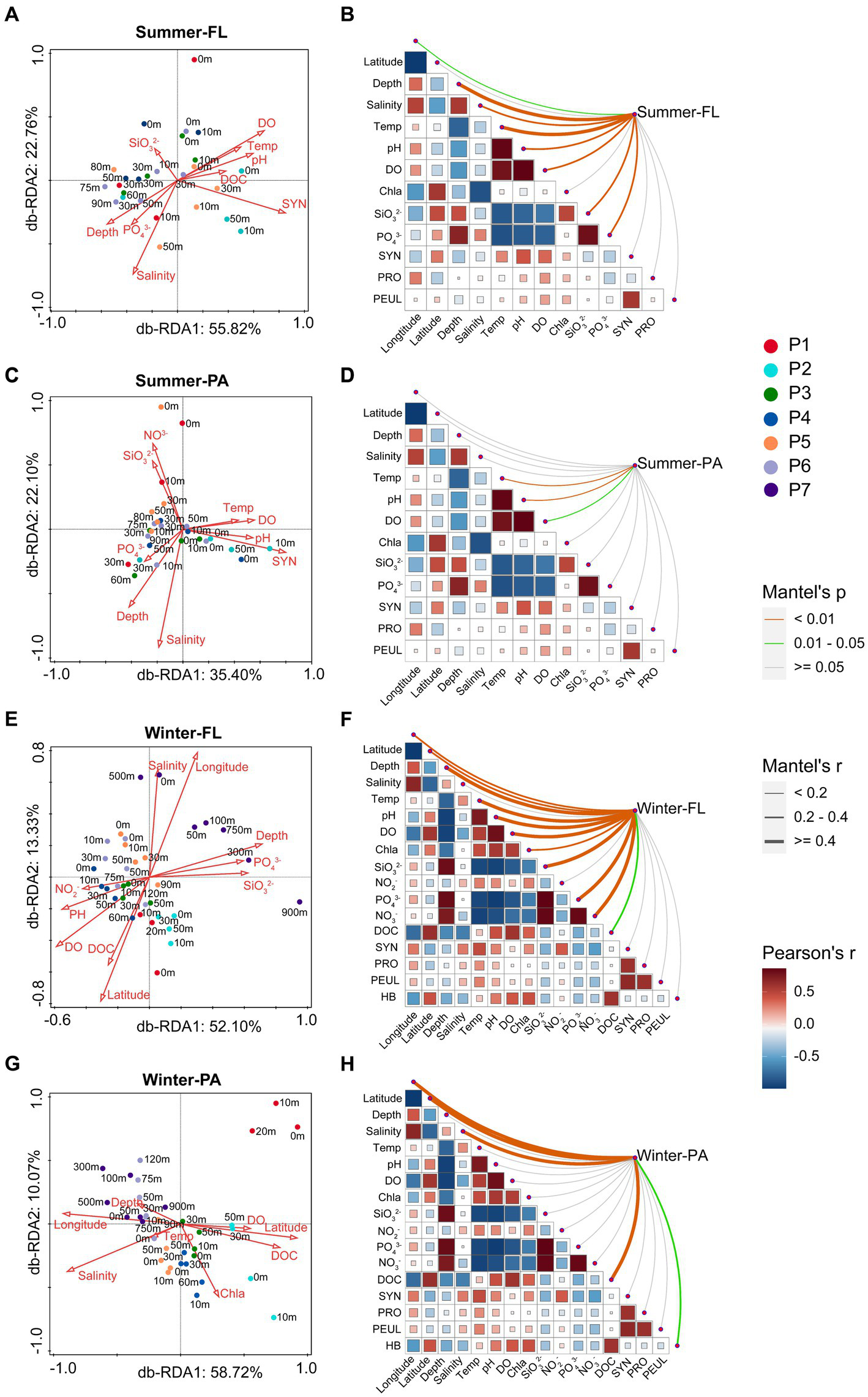 db-RDA analysis and Mantel test showing the relationship between microbial community structure based on OTU level and environmental factors along the PN section during summer and winter. FL: Free-living; PA: Particle-associated. (A,B) Free-living samples in summer; (C,D) particle-associated samples in summer; (E,F) free-living samples in winter; (G,H) particle-associated samples in winter. In (B,D,F,H), the size and color of the squares indicate the correlation coefficients between the environmental factors, the thickness of the lines indicate the correlation of the Mantel test between the microbial community and the environmental factors, and the color of the lines indicates the significance of the Mantel test between the microbial community and the environmental factors.