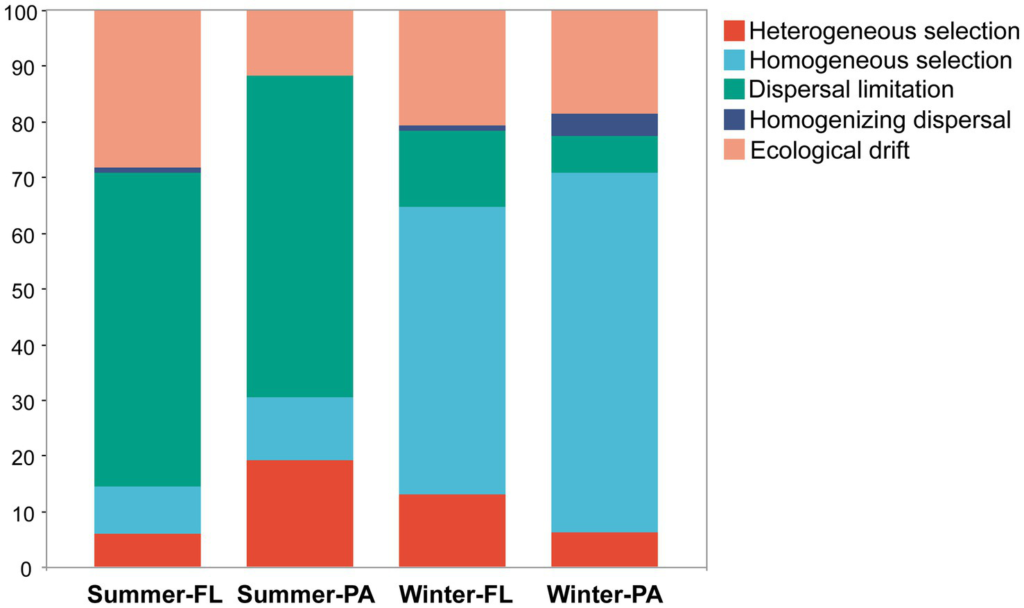 The βNTI analyses based on the null model revealed a clear difference of dominant processes in structuring the microbial communities along the PN section between winter and summer (Figure 9). In summer, the stochastic process represented by dispersal limitation was the most important process in either FL and PA communities (56.3 and 57.8%, respectively), while in winter, the major process turned out to be the deterministic process, homogeneous selection (51.5% in FL and 64.5% in PA). Additionally, heterogeneous selection accounted for higher proportions in determining PA communities (5.8%) compared to the FL communities (1.9%) in summer. Although selection was the most important structuring process in winter, the contribution of dispersal limitation was higher for the FL (13.7%), whereas homogenizing dispersal was slightly higher for the PA (3.9%) among the stochastic processes.