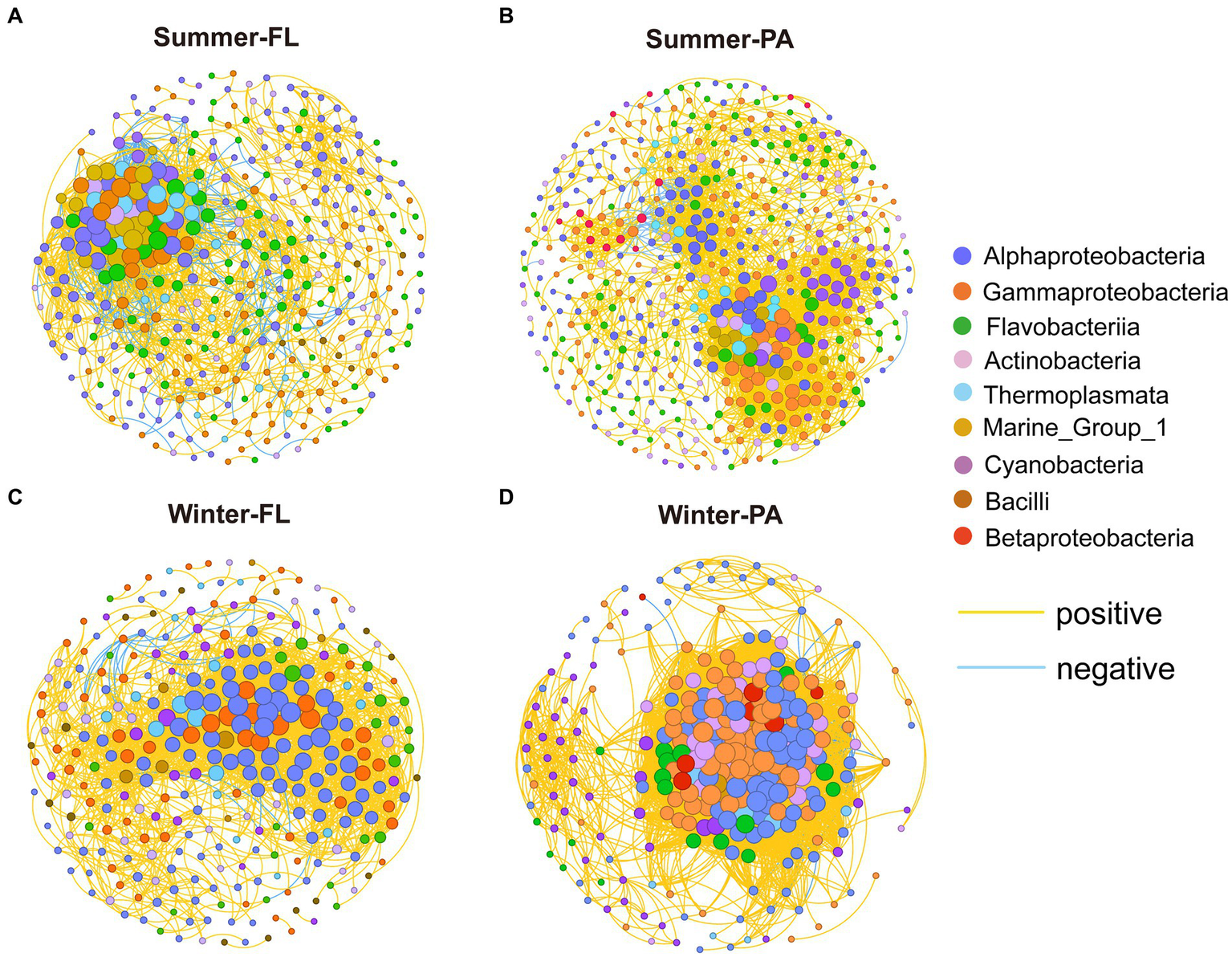 To study the microbial co-occurrence patterns along the PN section, we built co-occurrence networks for samples from different seasons and different lifestyles (Figure 10). Generally, the summer network exhibited lower average degree and average clustering coefficient compared with those of the winter network, whereas the average network distance and modularity was higher in summer than in winter. These results suggested that the microbial communities tended to be more connected in winter than in summer along the PN section. Specifically, the network of winter PA communities presented distinct topological properties compared with either summer communities or winter FL counterparts, showing lower node numbers and extremely high edge numbers (Supplementary Table S9). Correspondingly, higher average degree and clustering coefficient was shown by the winter PA network, while its modularity was lower (0.099). The OTUs from Alphaproteobacteria, Gammaproteobacteria, Flavobacteria, Actinobacteria, and Cyanobacteria displayed more correlations with others in these networks (Figure 10; Supplementary Table S9). Keystone OTUs in each network with high degree (>25) and low betweenness centrality (<262.32) were identified. Interestingly, the keystone OTUs in winter were dominated by Alpha- and Gammaproteobacteria (100% for FL and 89% for PA), while high proportions of archaeal keystone OTUs (Thaumarchaeota and Euryarchaeota) were identified in summer microbial networks (43% for FL and 28% for PA) (Supplementary Table S8).