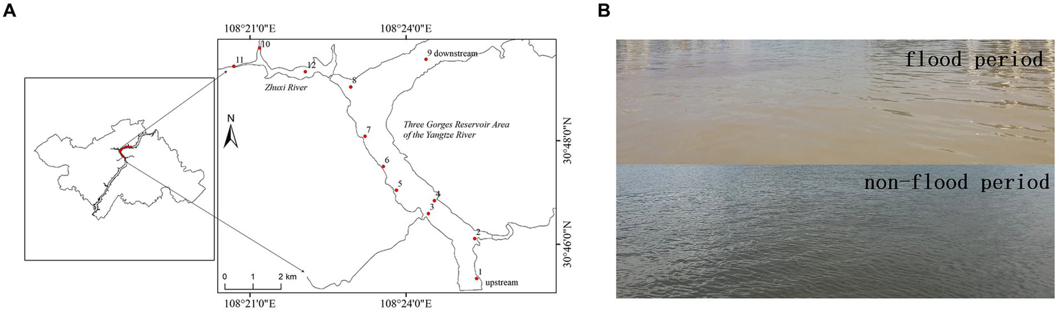 Map of the hinterland of the Three Gorges Reservoir Area (TGRA) of the Yangtze River showing the location of the 12 sampling sites (A). Representative photograph of water quality during the flood (August 2020) and non-flood period (August 2021) (B).