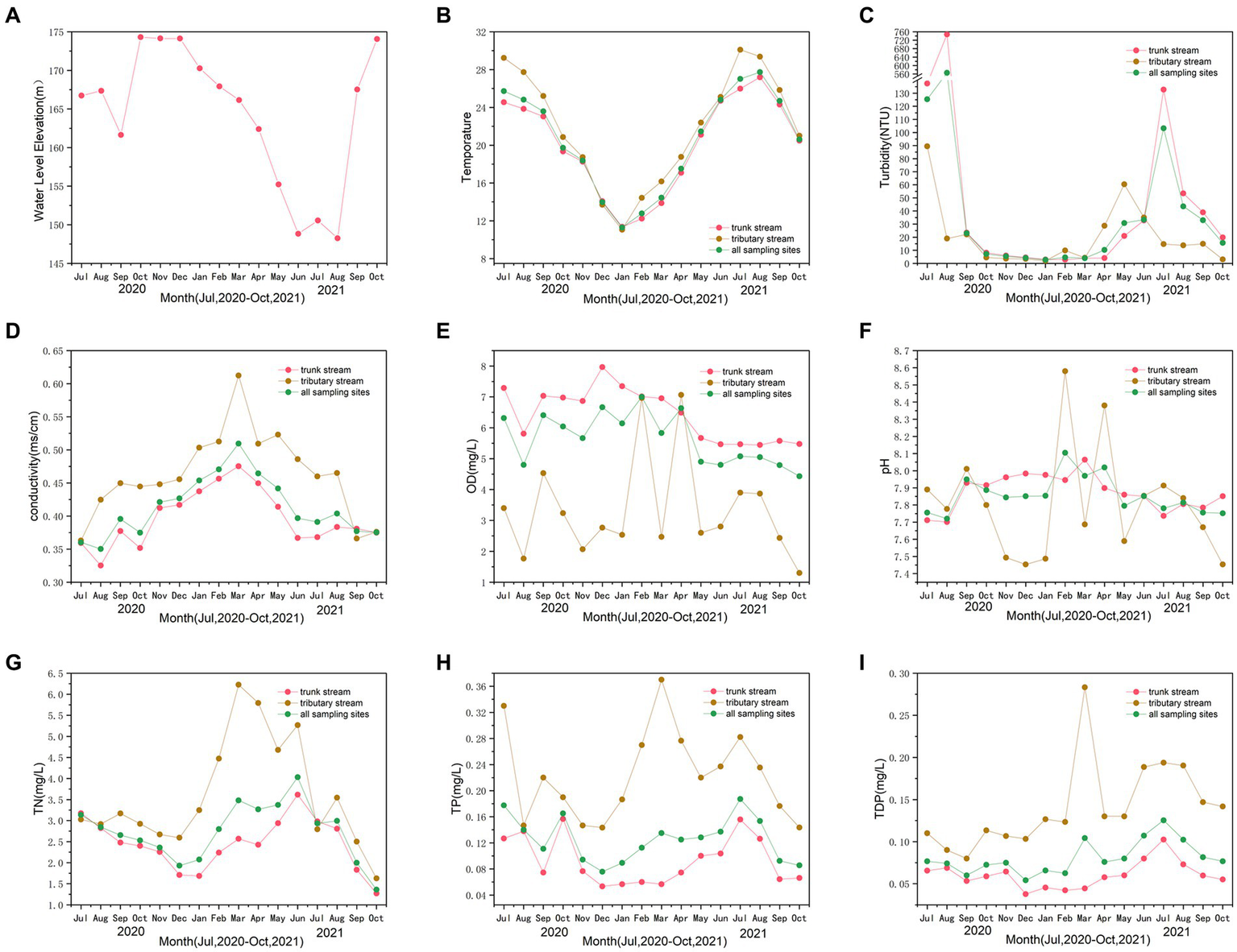 Figure 2A showed the variation in the water level elevation in the hinterland of TGRA. The water level elevation of TGRA remained at approximately 175 m during the storage period and began to decline in April to withstand possible seasonal floods. The water level elevation ranged from 148.25 to 174.30 m. The water level elevation during the flood period (July and August 2020) was 166.73 and 167.35 m. The water level elevation of the non-flood period (July and August 2021) was 150.55 and 148.25 m. Figure 2B displays the variation in water temperature throughout the sampling period. The water temperature ranged from 11.1°C in January 2021 to 30.1°C in July 2021. The line graph revealed fluctuations in variable turbidity, with periods of increase and decrease (Figure 2C). Turbidity ranged from 1.9 to 747.6 NTU. The variation in turbidity was from 2.7 to 7.2 NTU in winter and spring and from 10.2 to 103.2 NTU in summer and autumn of 2021. Moreover, the turbidity in flood period was from 23.1 to 564.4 NTU. The turbidity in flood period was significantly higher than that in the non-flood period (p = 0.001). Figure 2D shows that conductivity ranges from 0.325 to 0.612 ms·cm−1. The line graph demonstrated a volatile upward trend before March 2021 and a downward trend after that period. Frequent fluctuations in the DO values are shown from the line graph in Figure 2E. The DO ranged from 1.30 to 7.97 mg·L−1 and was higher in winter and spring and lower in summer and autumn for all sampling sites. This trend was more evident for the trunk stream. The line graph demonstrated volatility in pH, with frequent ups and downs (Figure 2F). The pH ranged from 7.45 to 8.58, with an average of 7.86. Figure 2F exhibited a gradual upward trend before February 2021 and a gradual downward trend after that.