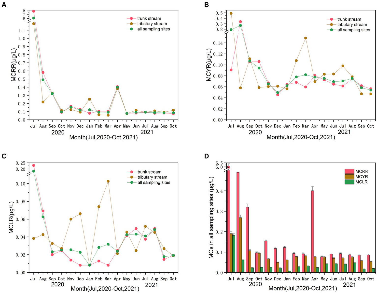 The trends of the three microcystin (MC) concentration of MCRR (A), MCYR (B), and MCLR (C) in trunk and tributary stream for the sampling period and all of sampling sites. The mean values of three MC concentrations in all sampling sites over the sampling period (D).