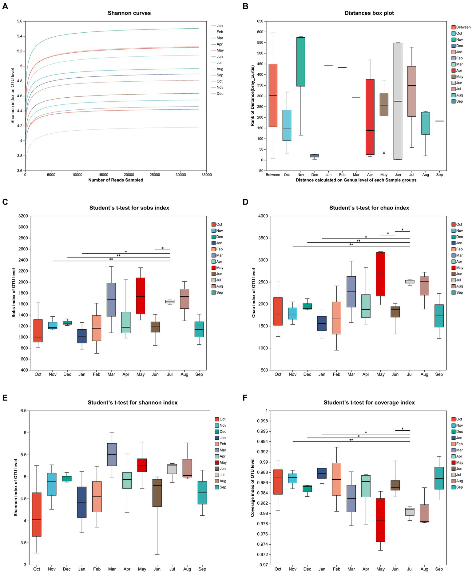 The Shannon curves on OTU level for sampling period (A). Analysis of similarities (ANOSIM) of 12 sampling groups (B). The mean values of sobs index (C), chao index (D), Shannon index (E), and coverage index (F) of OTU level for sampling period.