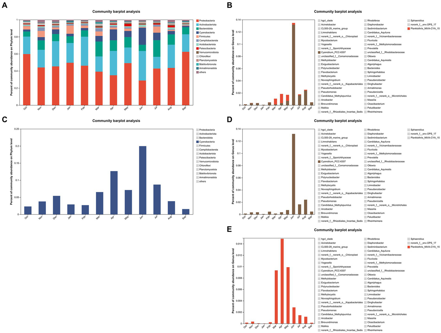 The proportion of community abundance (A) and cyanobacteria abundance (C) on the phylum level for all samples. The proportion of Cyanobium_PCC-6307 and Planktothrix_NIVA-CYA_15 abundance (B) on the genus level and the proportion of Cyanobium_PCC-6307 abundance (D) and Planktothrix_NIVA-CYA_15 abundance (E) on the genus level, respectively.