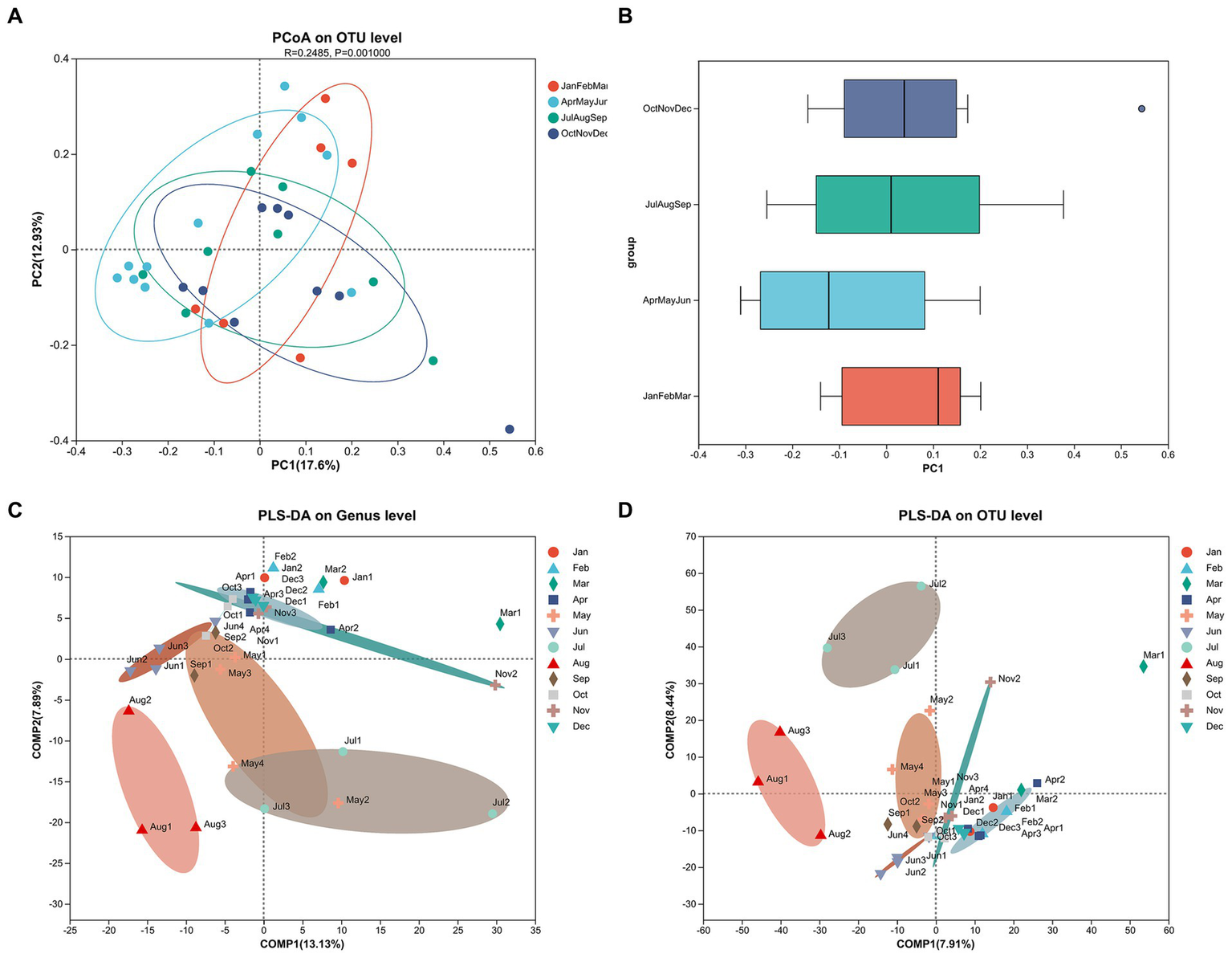 Figures 6A,B display principal coordinate analysis (PCoA) on OTU level by using the bray Curtis distance algorithm subgrouping by season. Figure 6A indicates the significant differences between seasons (PERMANOVA, R2 = 0.2485, p = 0.001). Figures 6C,D display the partial least square discriminant analysis (PLS-DA) on genus and OTU levels to analyze the difference of species composition between the sampling groups. Notably, Figure 6C indicates that the species composition on the genus level in May, June, July, and August had differences compared with other months.
