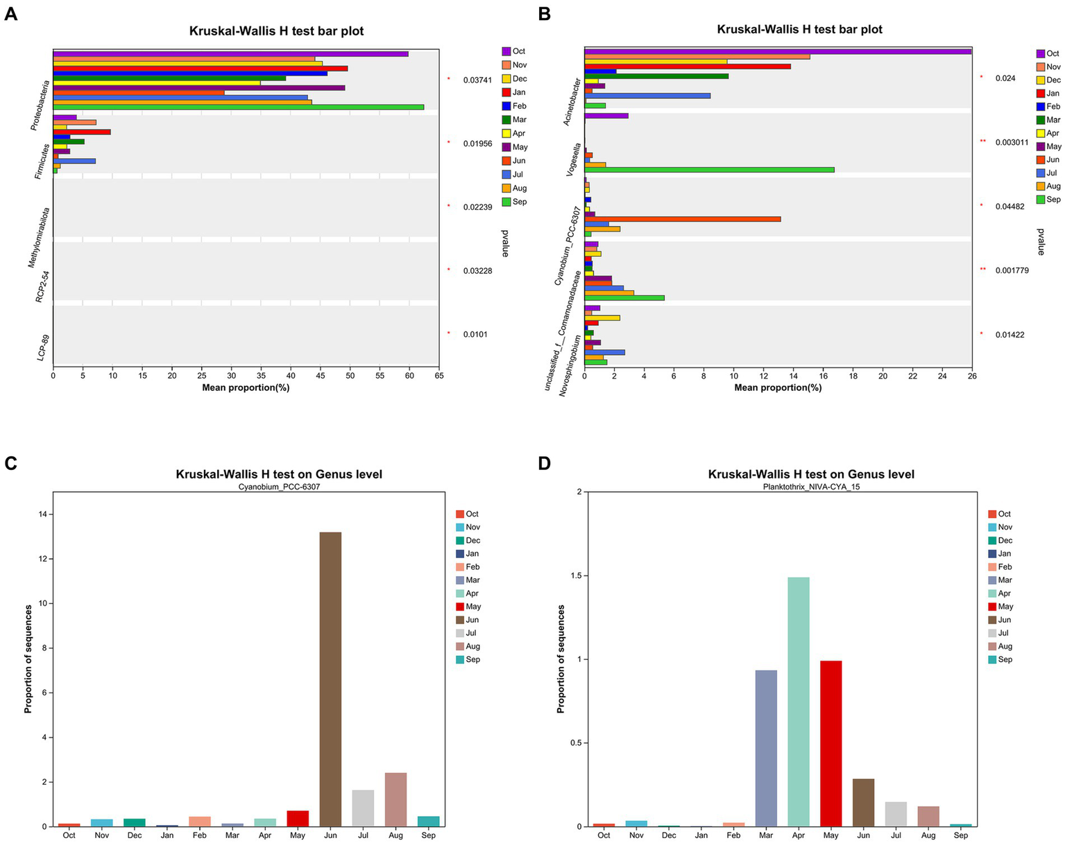 The Kruskal–Wallis H test top 5 species with significant differences on phylum level (A) and genus level (B) for all samples, respectively. The Kruskal–Wallis H test in Cyanobium_PCC-6307 abundance (C) and Planktothrix_NIVA-CYA_15 abundance (D) on genus level by month, respectively.
