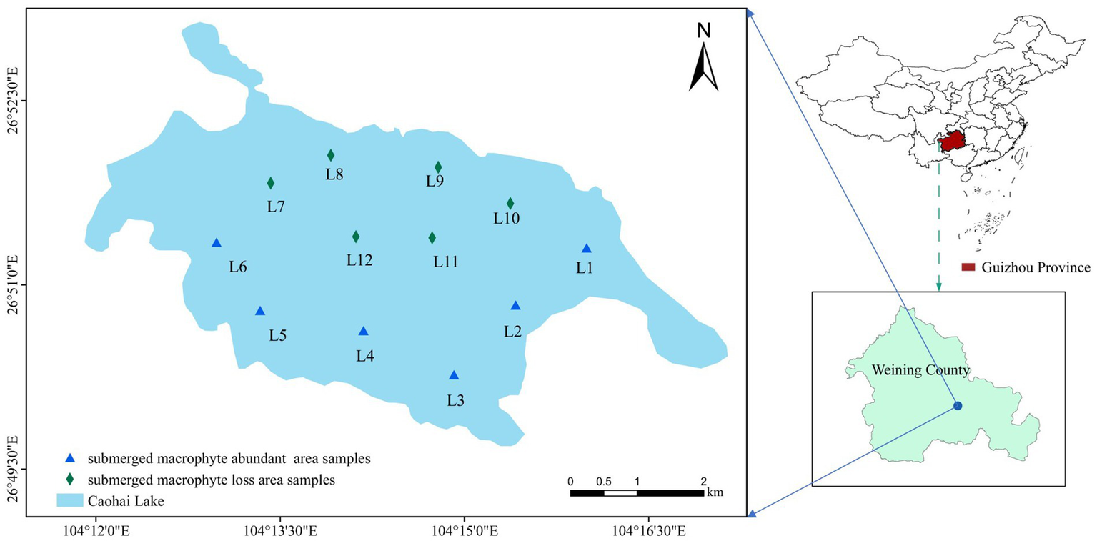 The loss of submerged macrophytes has become a serious ecological problem in shallow lakes worldwide (Rozemeijer et al., 2021). Zhang et al. (2017) conducted a quantitative assessment of 155 lakes around the world and found that the rate of submerged macrophyte loss (in cover and area) after 2000 was 33.6% ± 59.8% per year, especially for lakes larger than 50 km2, and the decreasing trend in submerged macrophytes was the most pronounced among all aquatic vegetations. Furthermore, a survey of submerged macrophytes in 14 typical shallow lakes in China found that Submerged macrophytes have been gradually degraded since the early 20th century (Huang et al., 2021). Caohai Lake is the largest shallow lake in Guizhou, since July 2020, the local waters of submerged macrophytes began to decline in large areas, the clear water state gradually to the turbid water state development (Li et al., 2023). Submerged macrophytes are the major producers in lake ecosystems, providing habitats for aquatic life, maintaining biodiversity, and inhibiting algal growth (Wood et al., 2017; Amorim and Moura, 2020; Wang et al., 2021; Misteli et al., 2023). However, the gradual loss of submerged macrophytes can have certain impact on shallow lake ecosystems. It will not only by can trigger the redistribution of various nutrients in sediment and water (Huang et al., 2021), and even cause the lake to transform from a clear water state dominated by submerged macrophytes to a turbid water state dominated by phytoplankton, with a consequential decline in its ecological functions (Ardichvili et al., 2023).