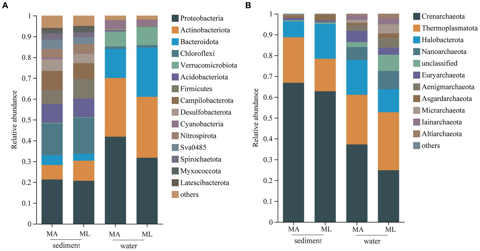 At the phylum level, the average relative abundance of the bacteria (A) and archaea (B) in sediment and water in the submerged macrophyte abundant (MA) area and submerged macrophyte loss (ML) area.