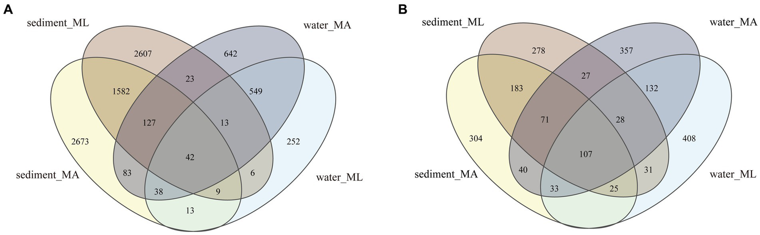 At the ASV level, Venn diagrams of bacteria (A) and archaea (B) community in sediment and water in the submerged macrophyte abundant (MA) area and submerged macrophyte loss (ML) area.