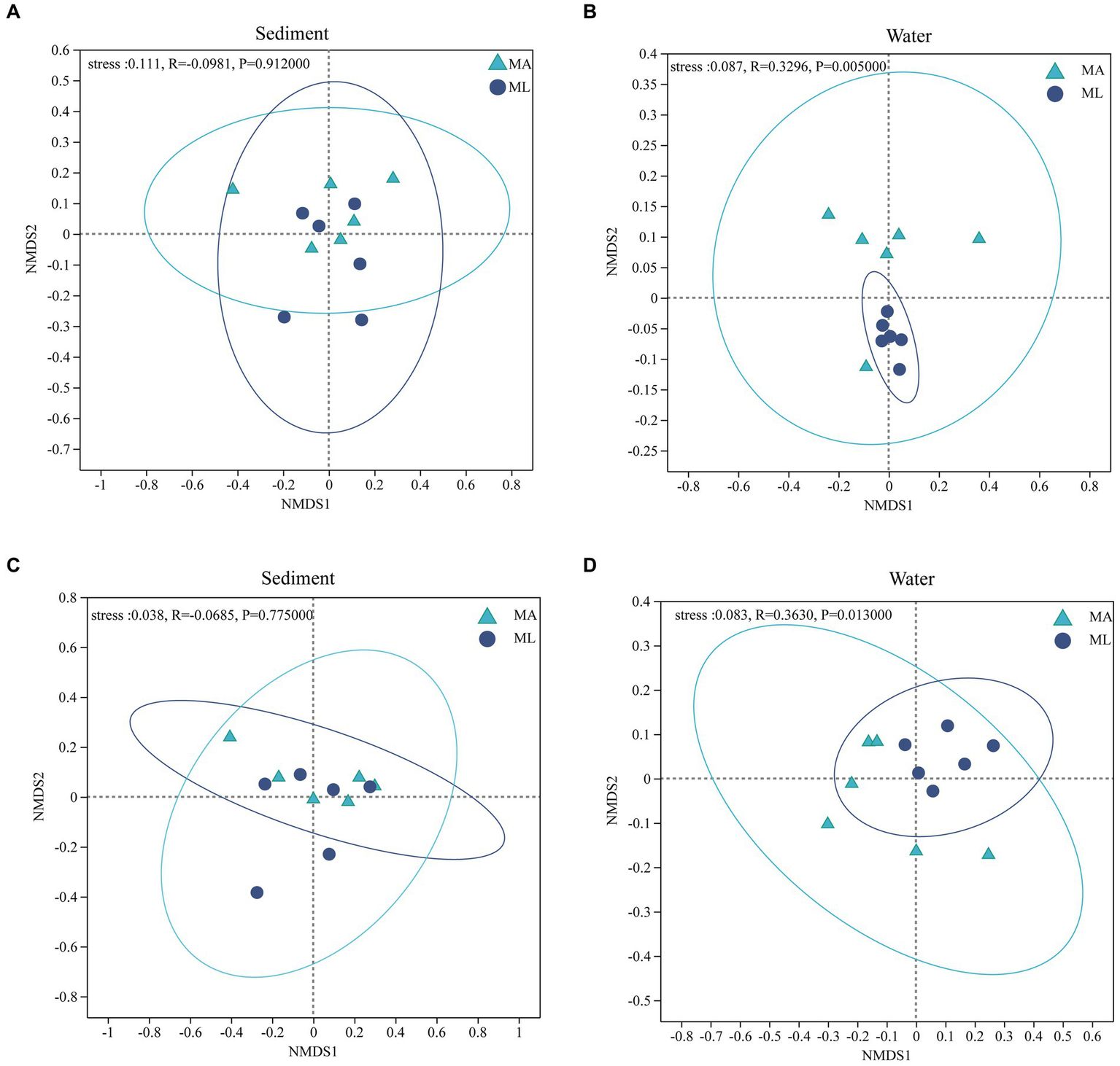 At the genus level, non-metric multidimensional scaling (NMDS) ordination of the bacteria (A,B) and archaea (C,D) community in sediment and water between the submerged macrophyte abundant (MA) area and submerged macrophyte loss (ML) area (calculated using Bray-Curtis).
